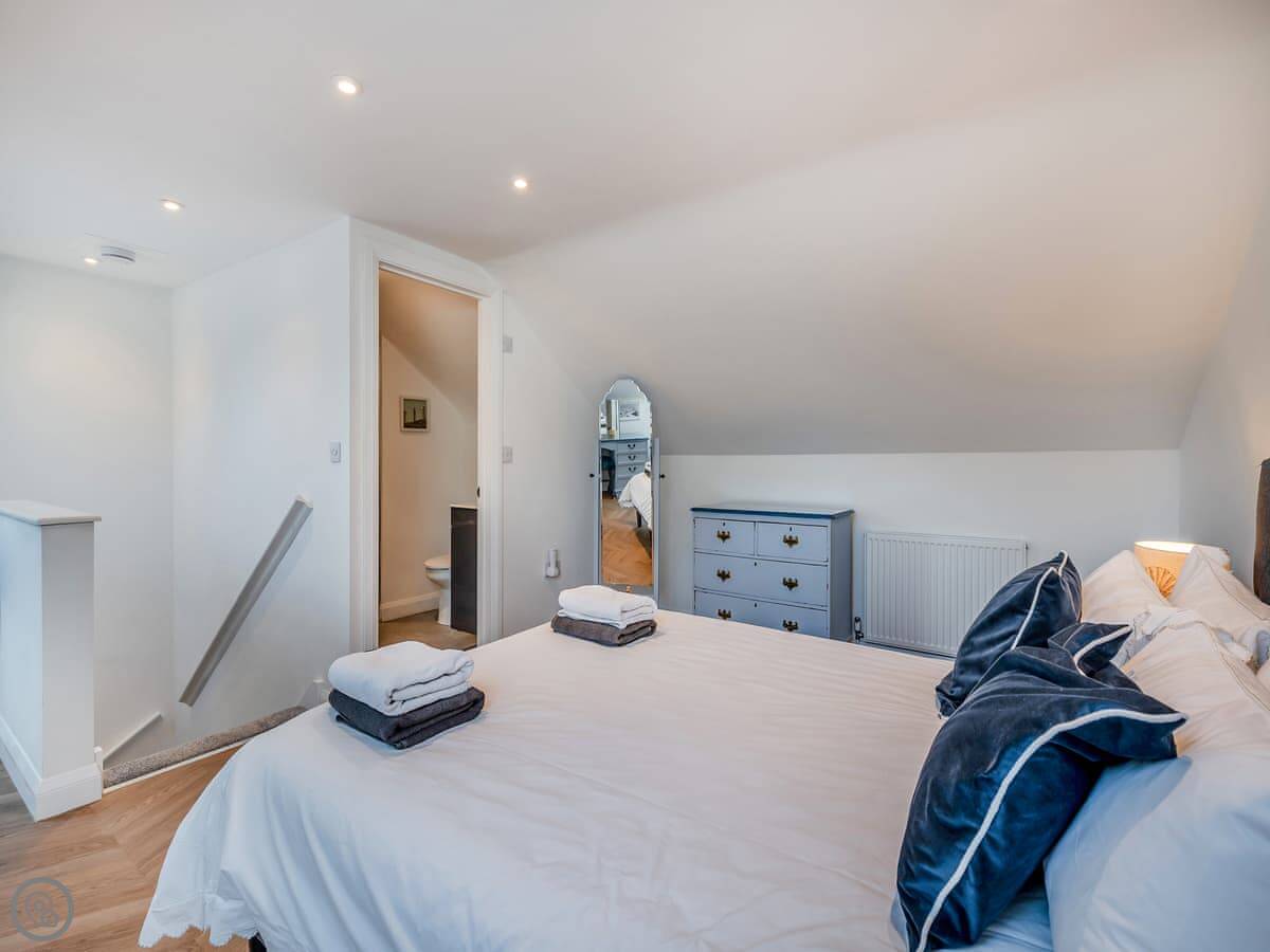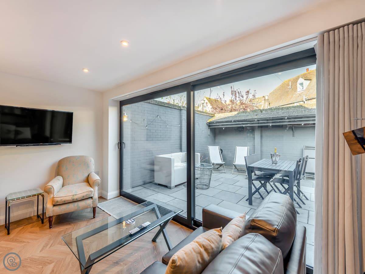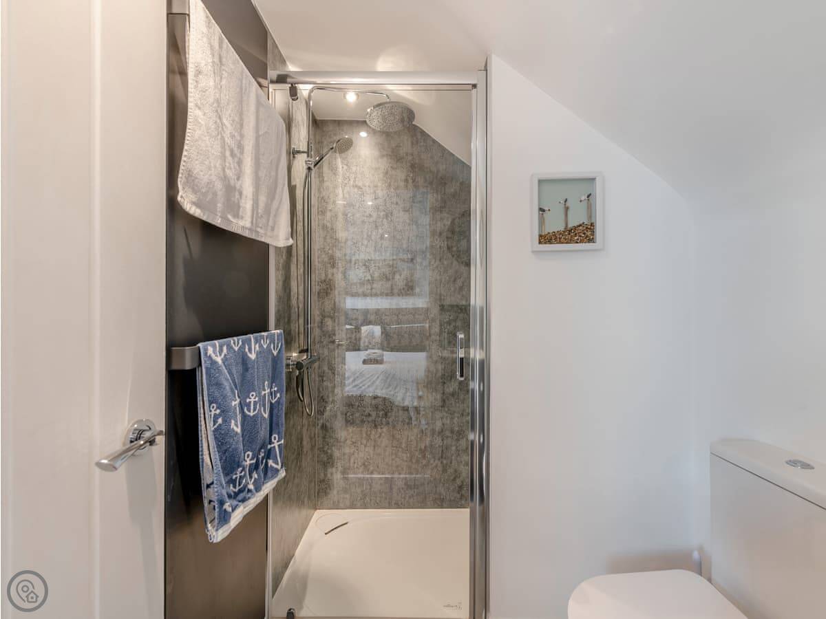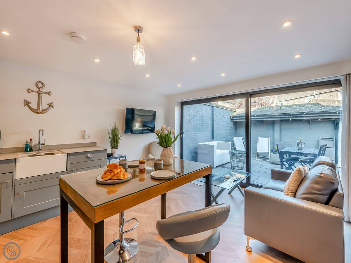 It's open plan downstairs with a kitchen area, and the bathroom has a walk in shower. Outside there's a patio that's just for you. It's enclosed, so it's private.