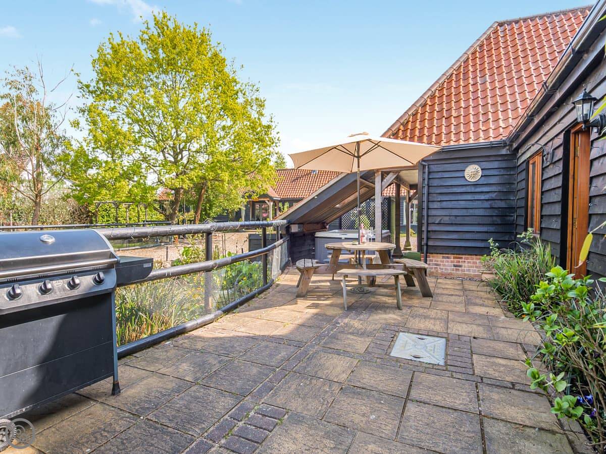 The place is rated 4 Star. It's comfortable and well-equipped. There are comfy sofas, a wood burner, and TVs with Netflix. The gardens are big, nearly three acres. Part of that is a fully enclosed dog field, about an acre, so dogs can run safely. We take up to five dogs. There are lawns, patios, BBQs, and two hot tubs that each fit six people.