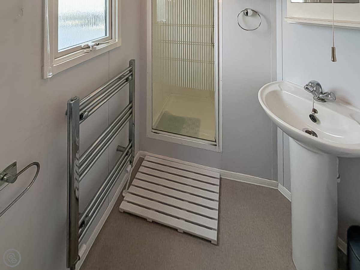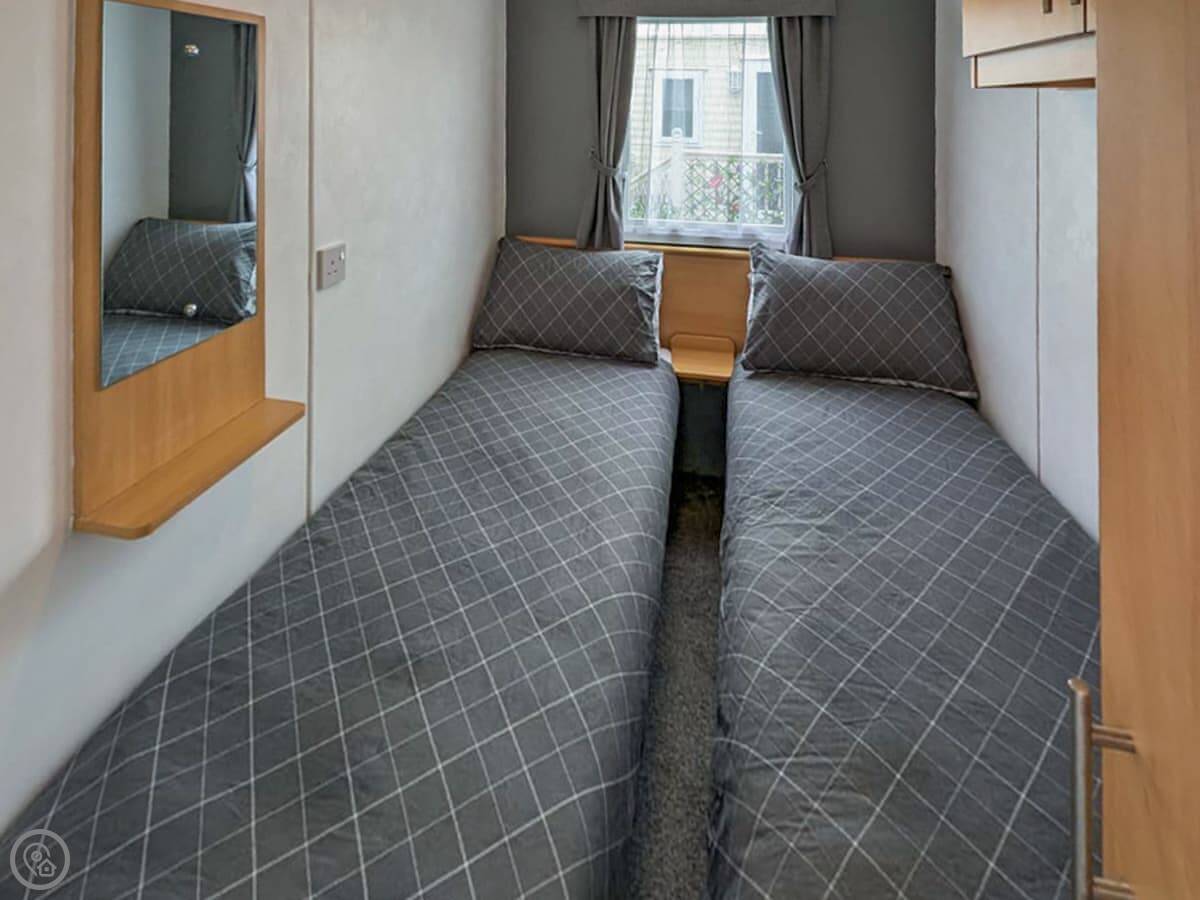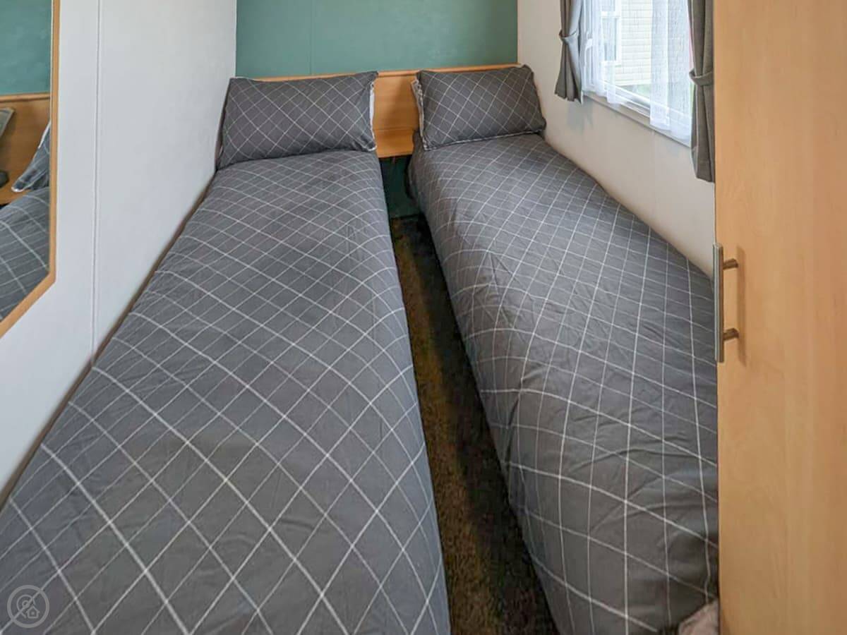 It sleeps eight, though it has three bedrooms: one double and two twins. There's a sofa bed in the lounge for the extra two people. One bathroom with a shower. It's a detached caravan, so no shared walls.
