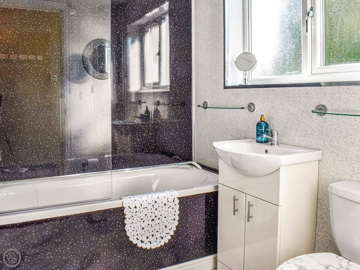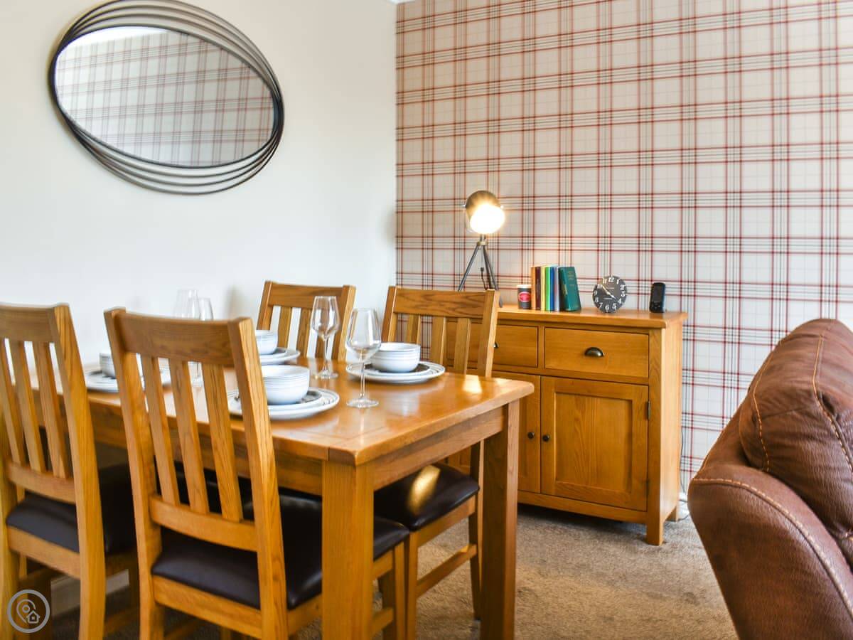It sleeps four in two bedrooms, one double and one twin. There's one bathroom with a bath and a shower over it. The living area is open plan and has two sofas. The kitchen is compact but has what you need.