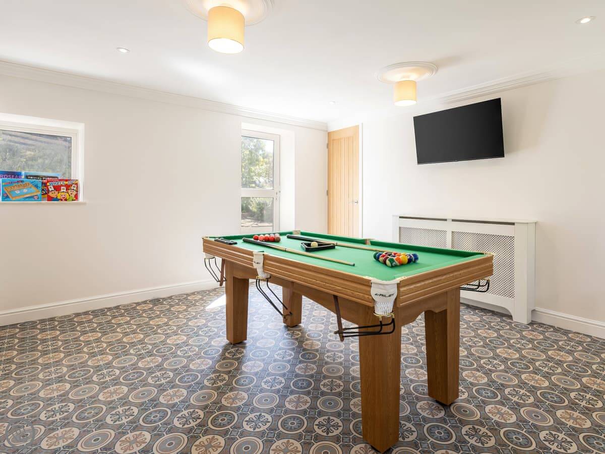 The garden is enclosed, which is good if you're bringing dogs. We allow up to two. There's a games room with a pool table off the living room. The kitchen is a decent size with a table for everyone.