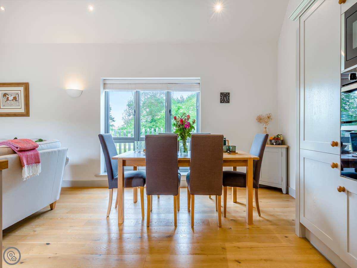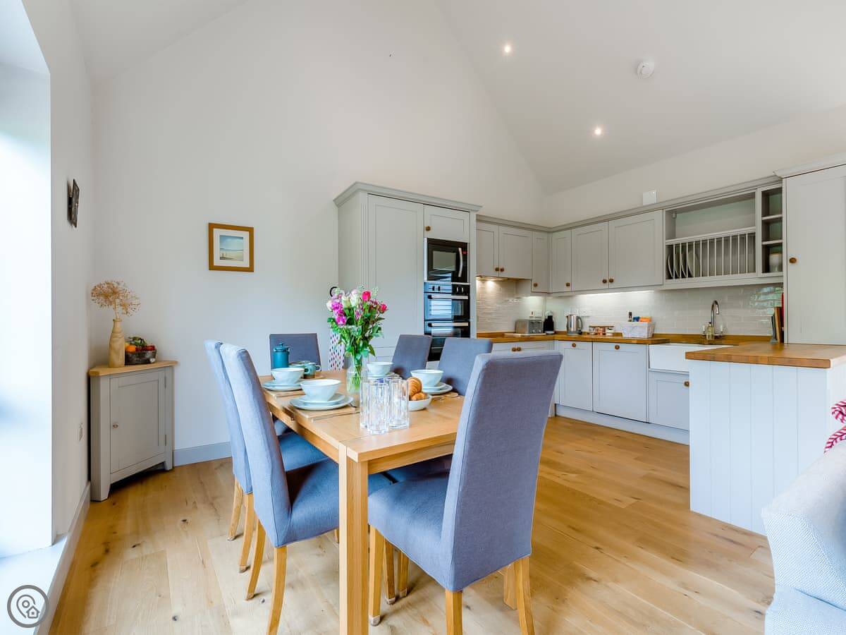 The main room is open plan, with the kitchen, dining area and sitting area all together. The ceiling is vaulted with wooden beams. There's underfloor heating.