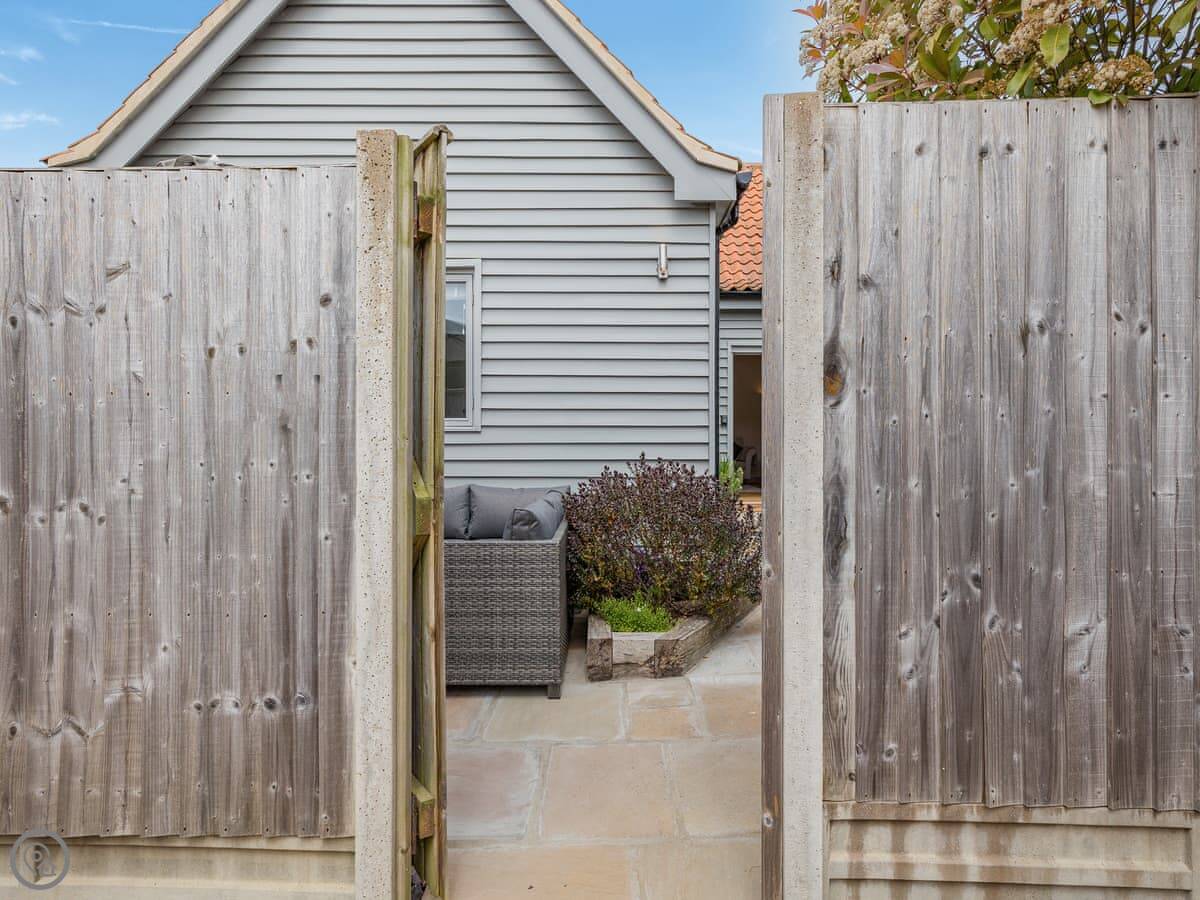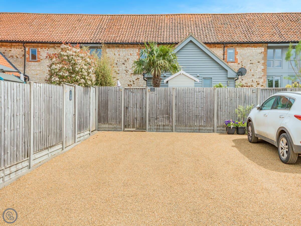 This is Lavender Barn in Heacham. It's a single storey barn conversion, so everything's on the ground floor. You get your own bit of garden all the way around it, mostly patio with some gravel.