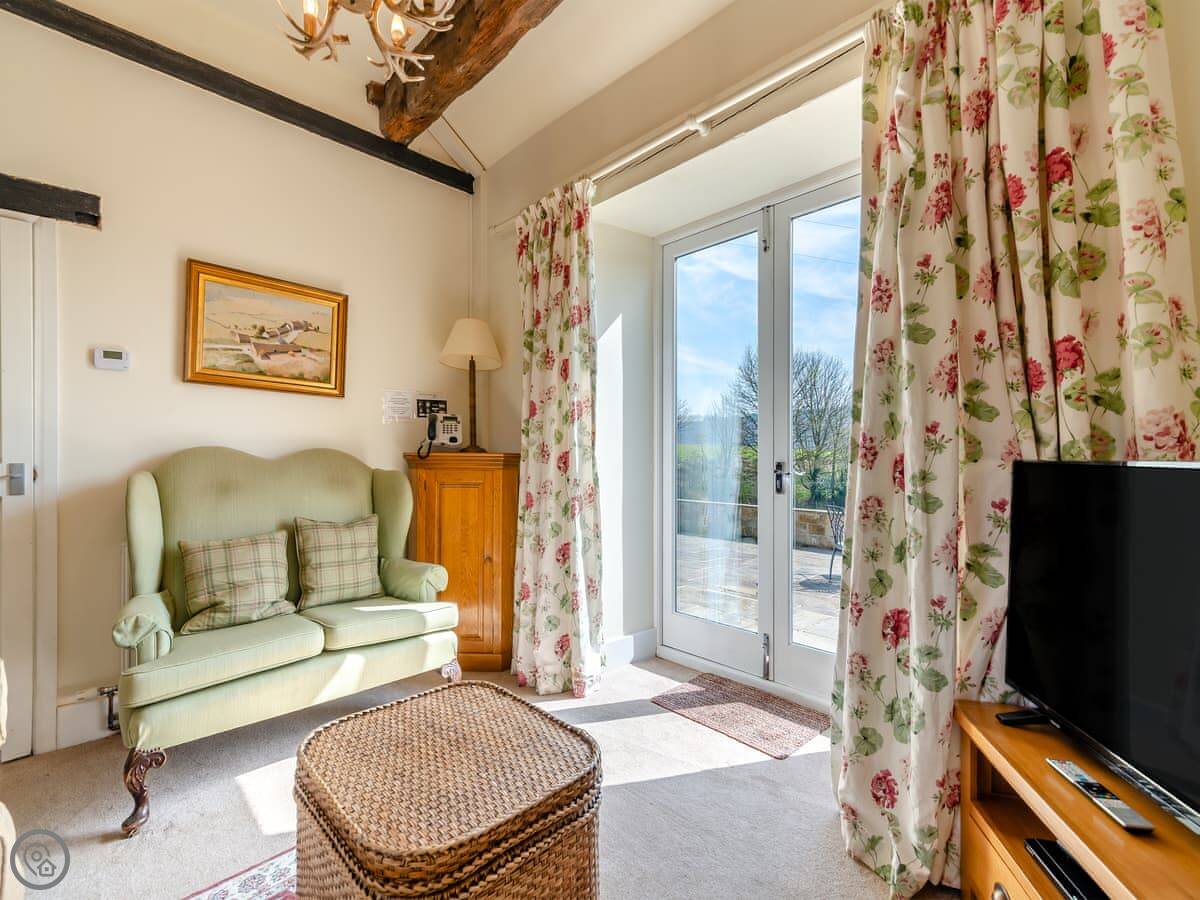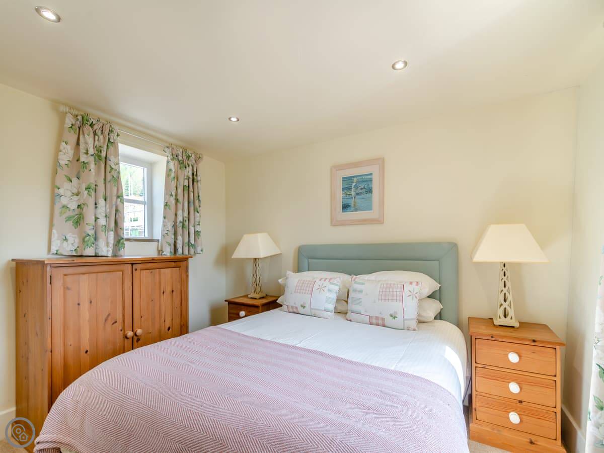 It's a 4 Star place, sleeps three. All on one level, which is handy. Two bedrooms. One has a king-size bed, the other a single. There's a shower room. The main room has french doors that open onto a raised patio. The view from there is good, over the valley. The kitchen's up two steps from the living area.