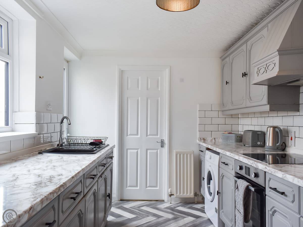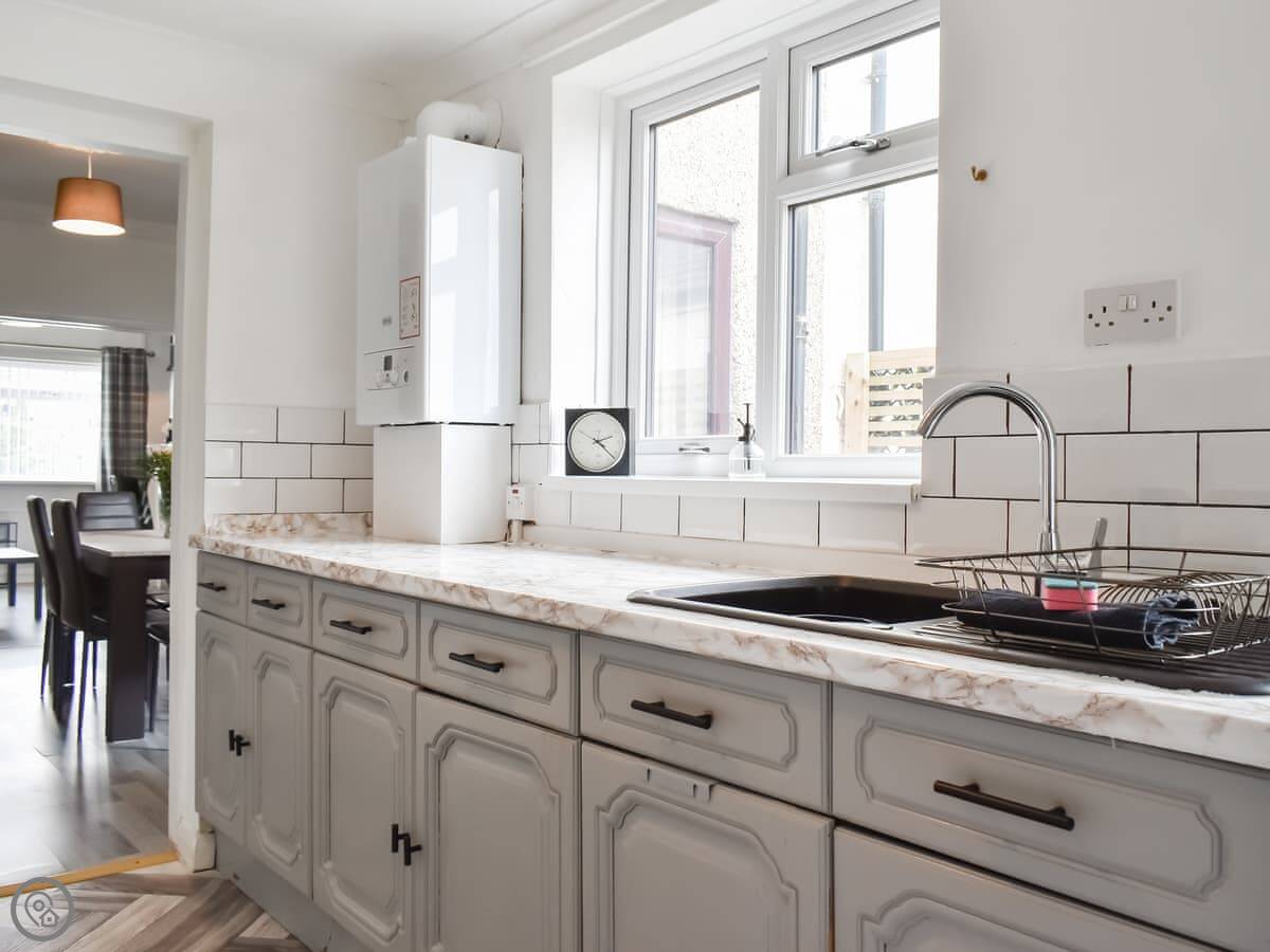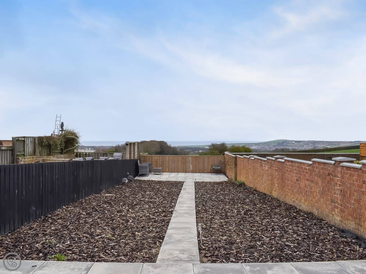 The living room is at the front. There's a dining room next to it with more seating. The kitchen is at the back, a galley style. The door leads out across a small footpath to your private garden. It's enclosed, which is handy with dogs. You can see the sea from there, on a clear day.