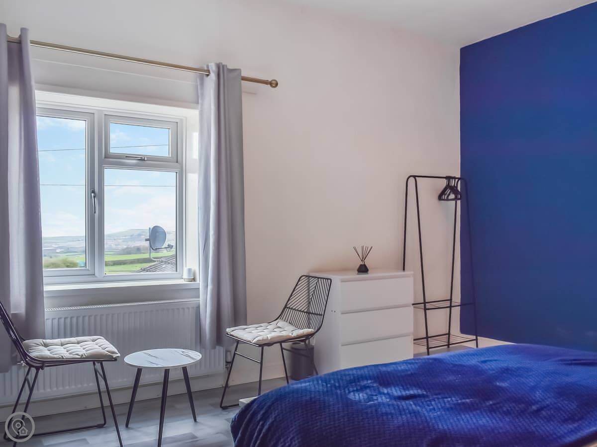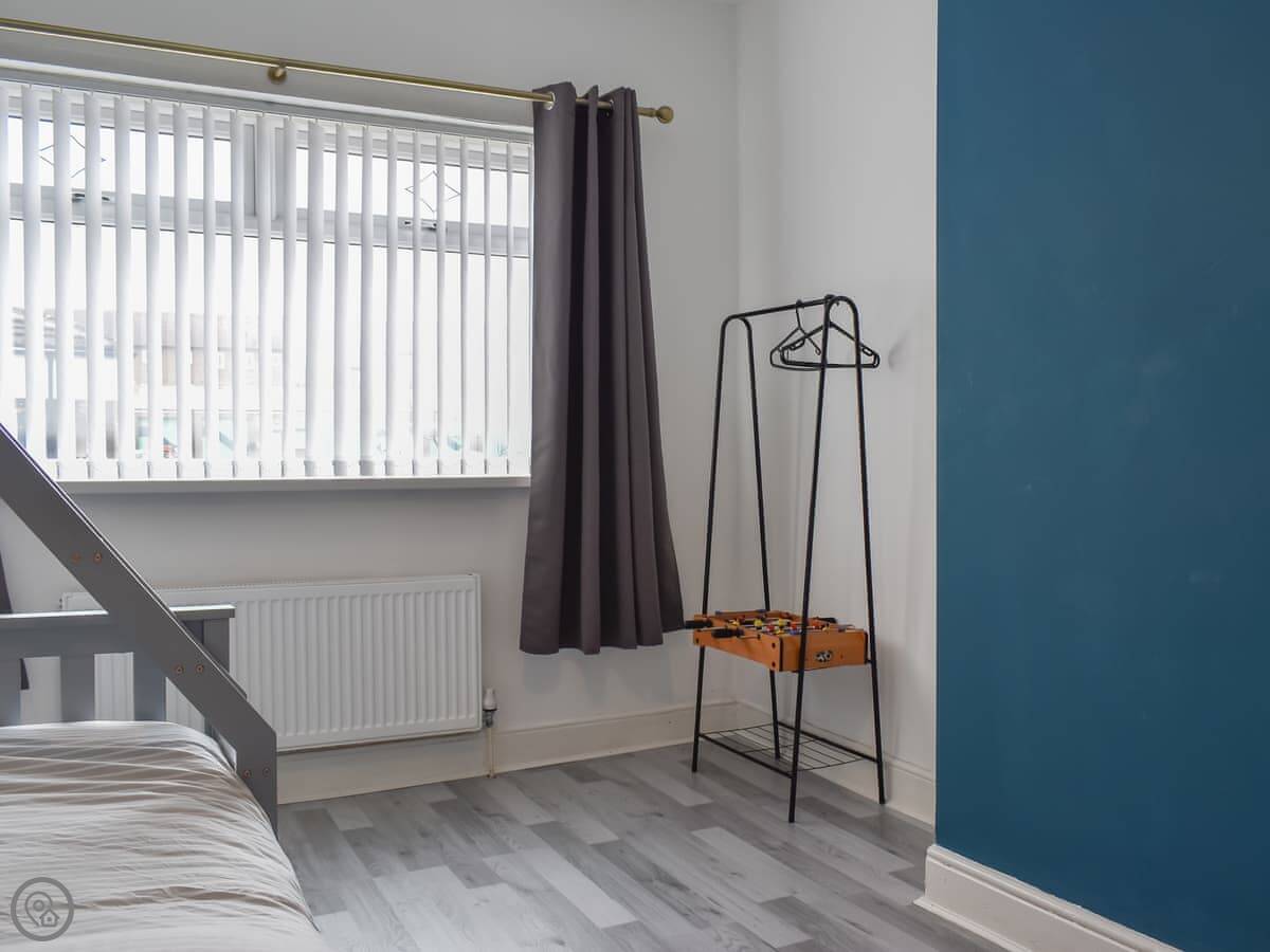 It sleeps five. Two bedrooms, one bathroom. It's a 4 Star place. The main bedroom is a double. The second room has a bunk bed: a double on the bottom and a single on top. The bathroom is downstairs.