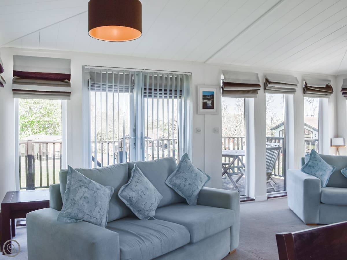 The main room is open plan, with the kitchen, dining, and living area all together. Doors lead out onto a good-sized, private deck that wraps around part of the lodge. It gets the sun.