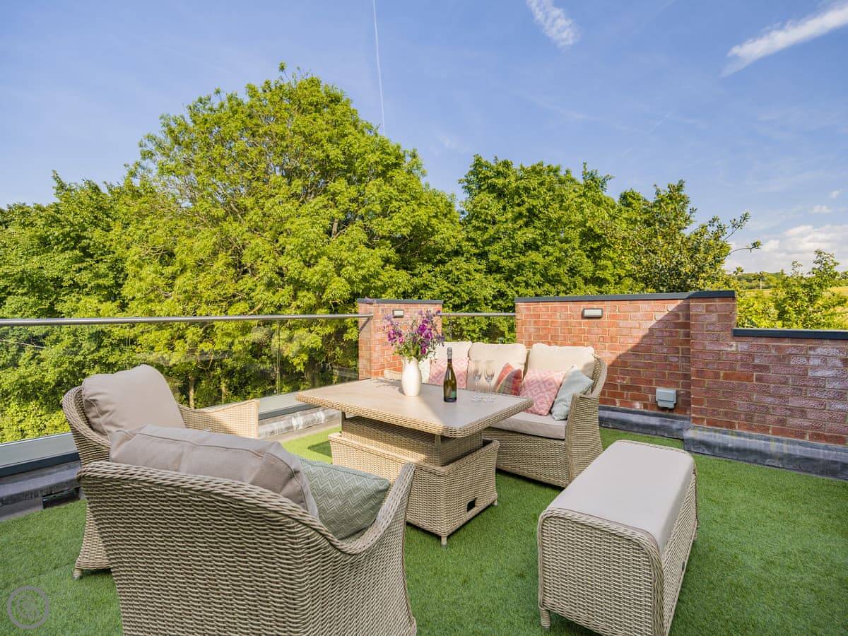 Upstairs is open plan, so everyone can be together. There's an open fire. The balcony is glassed in, so you can use it even if it's windy. It gets the sun, has seating and a BBQ. You look out over fields.