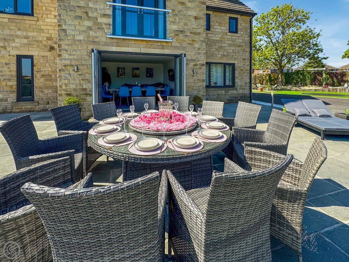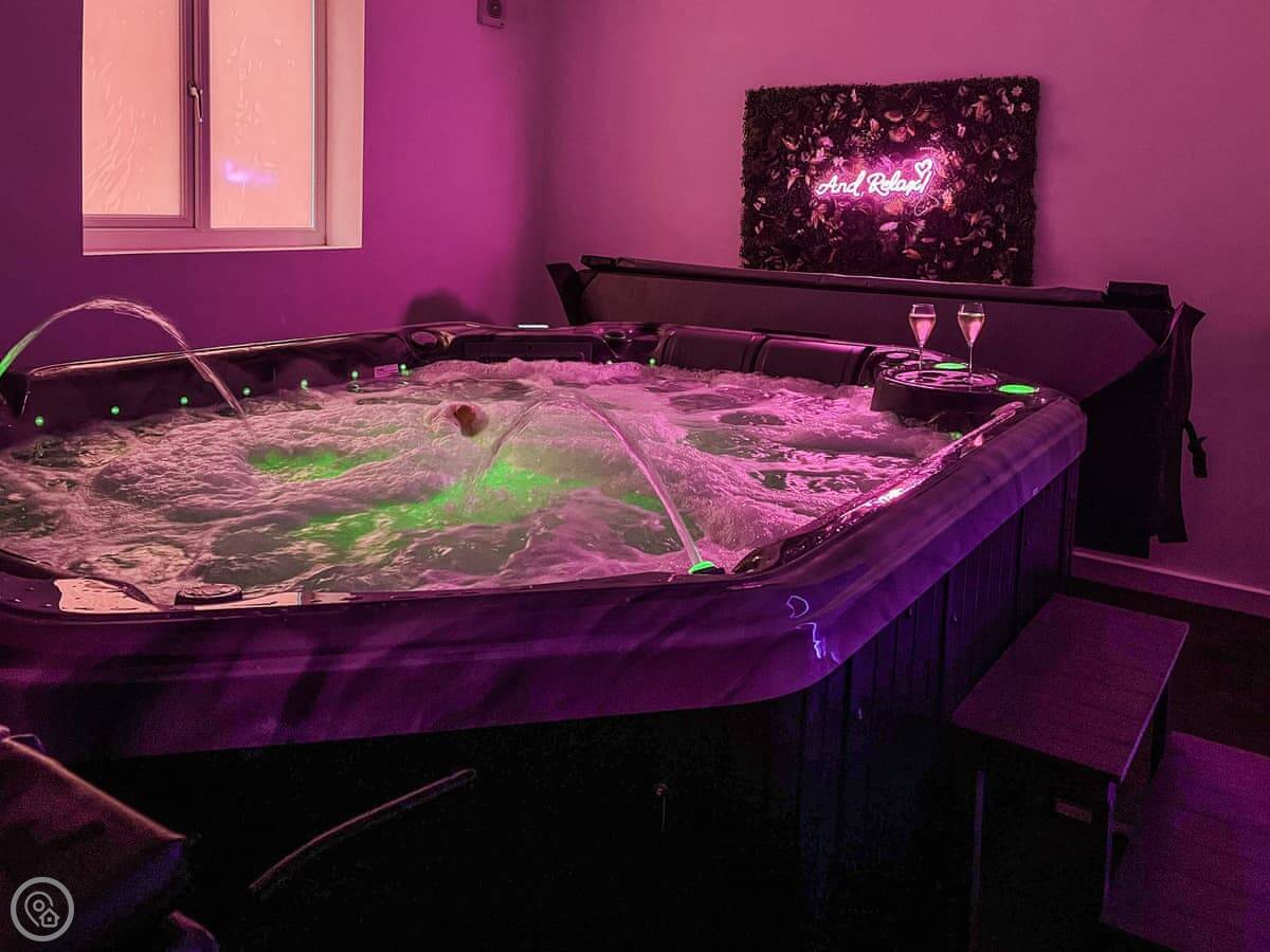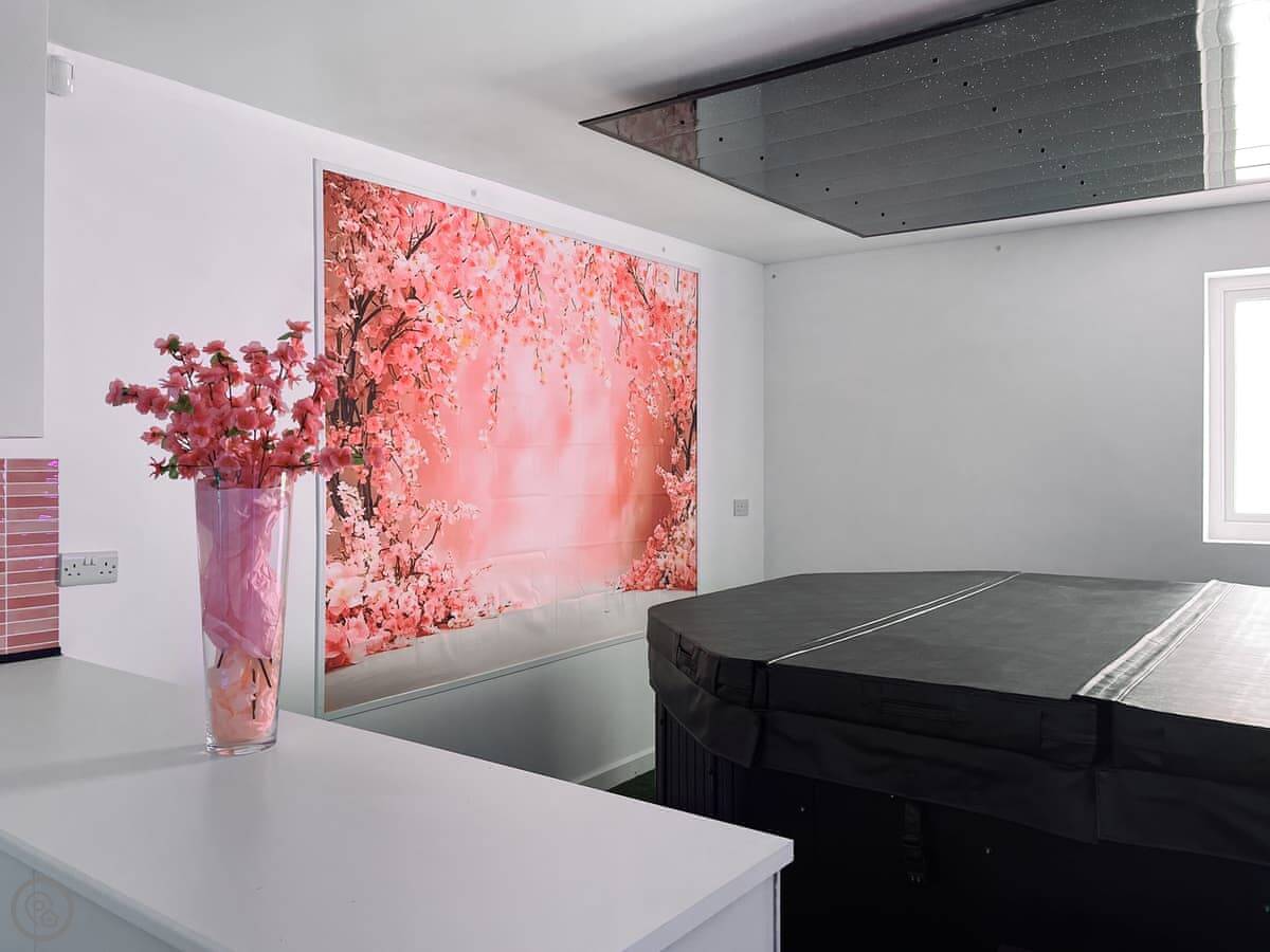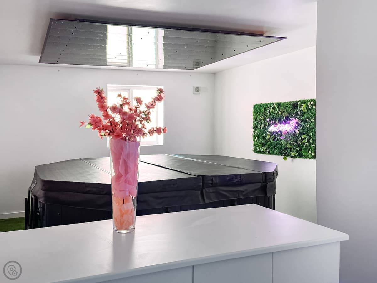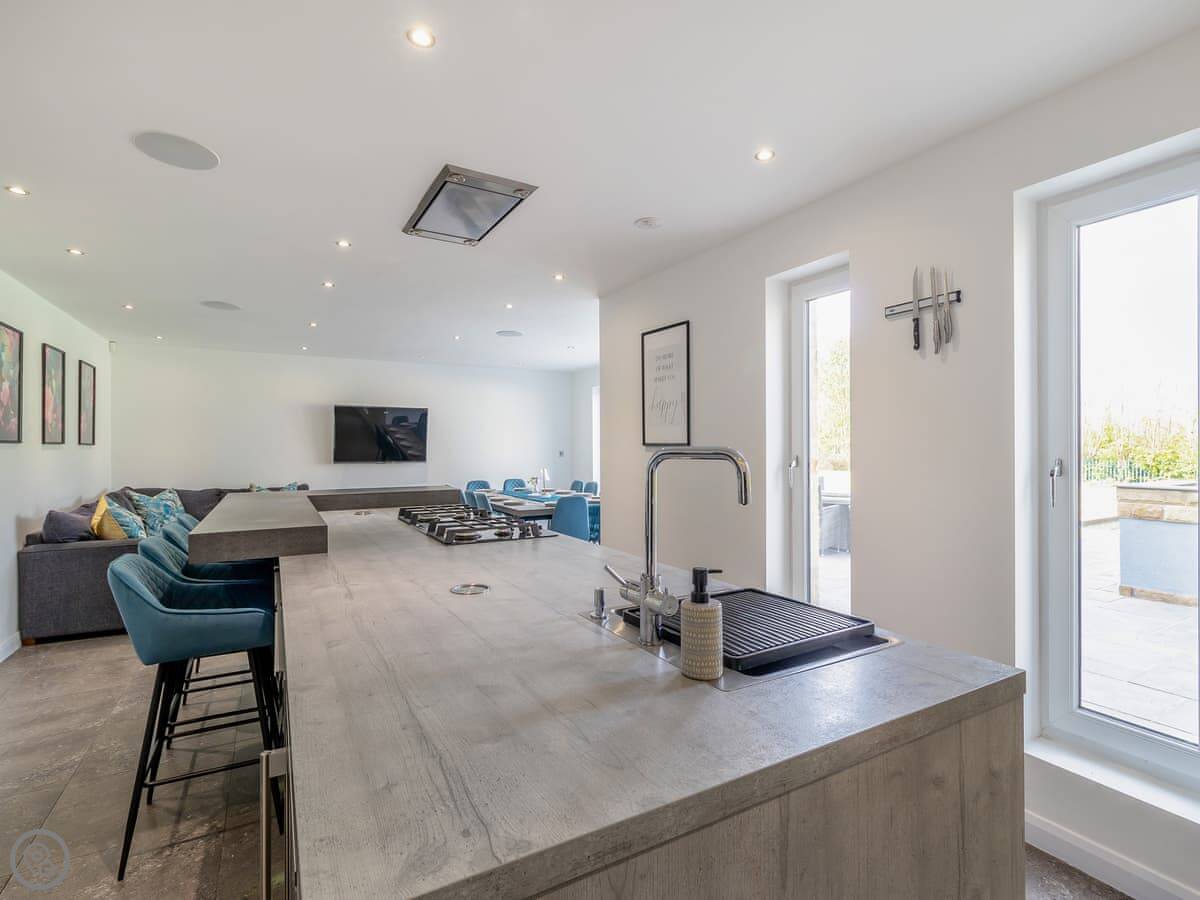 The main living area is all open plan: kitchen, dining, and sitting area together. The bifold doors open right onto the garden. There's a hot tub in its own room on the ground floor. It's for twelve people.