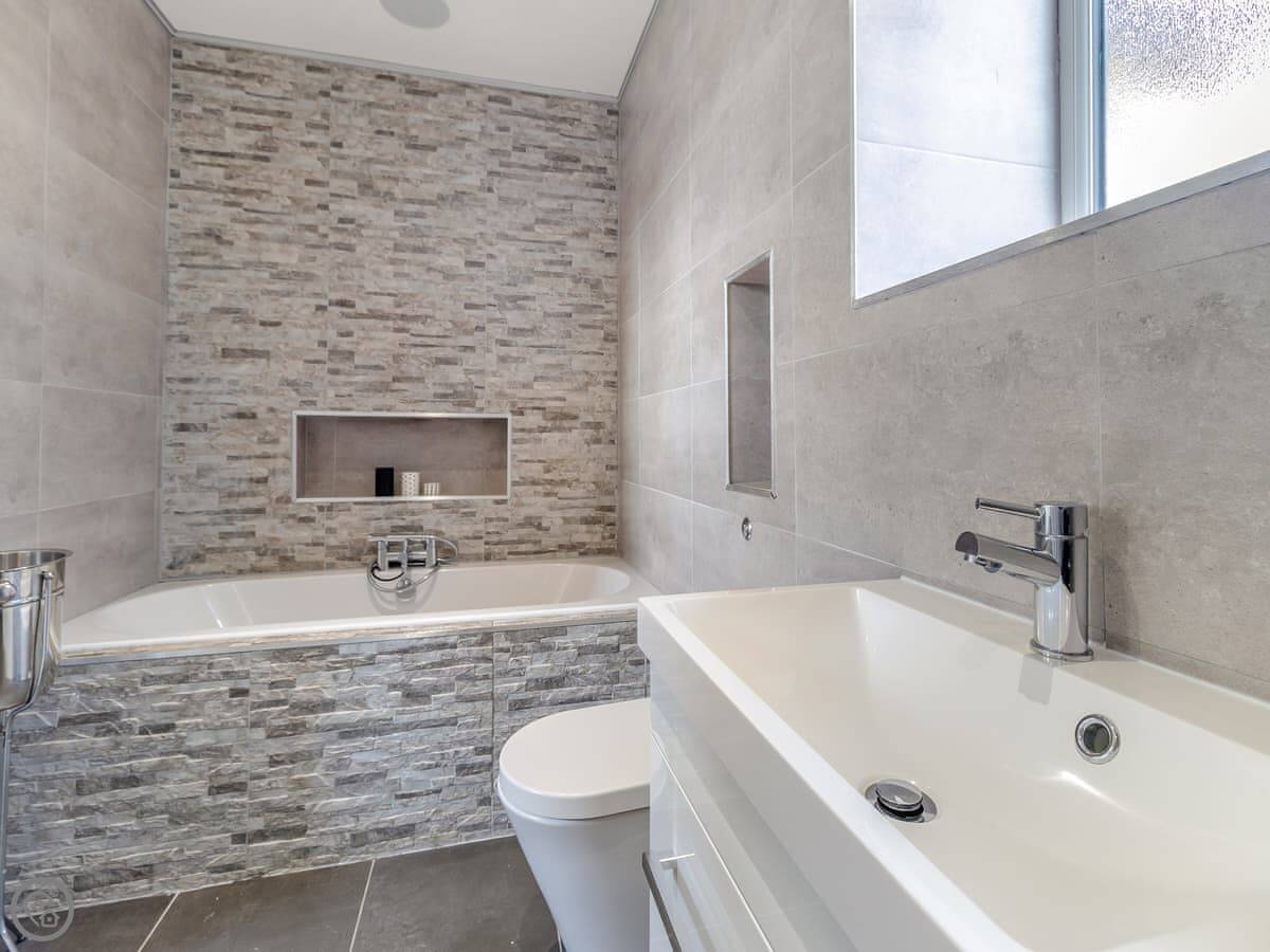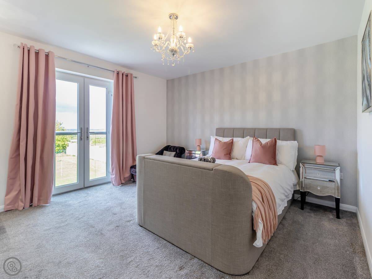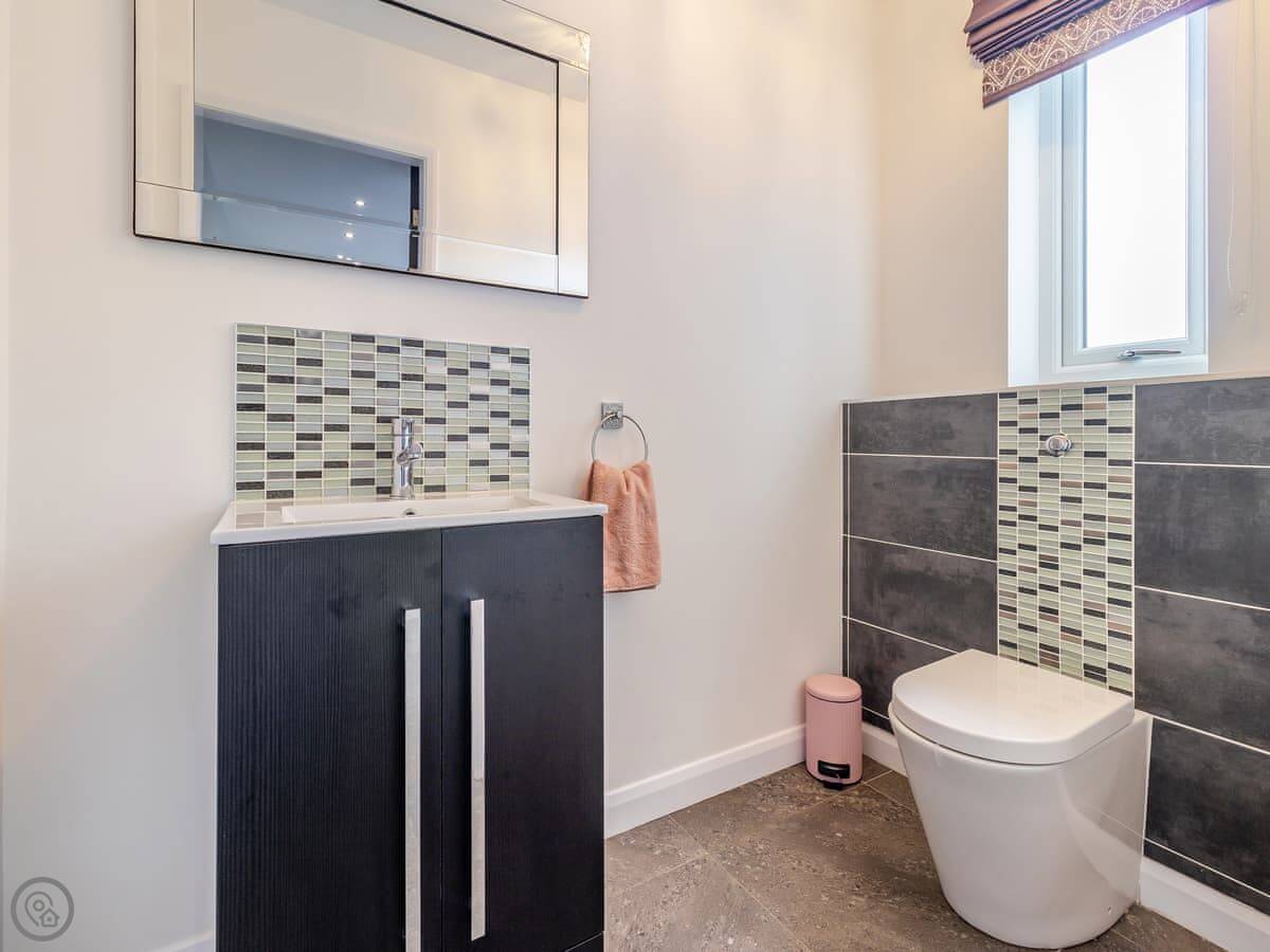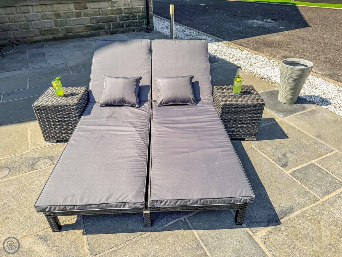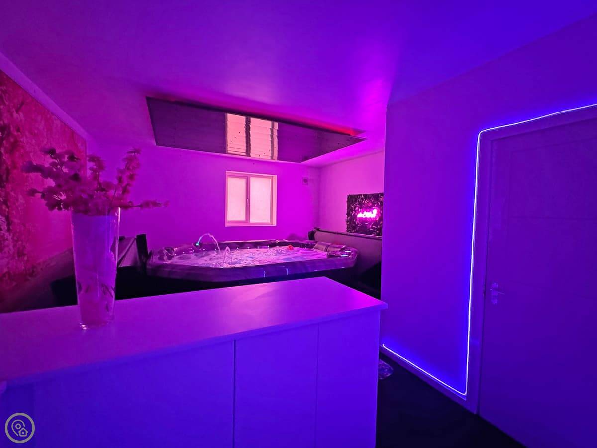 The main living area is all open plan: kitchen, dining, and sitting area together. The bifold doors open right onto the garden. There's a hot tub in its own room on the ground floor. It's for twelve people.