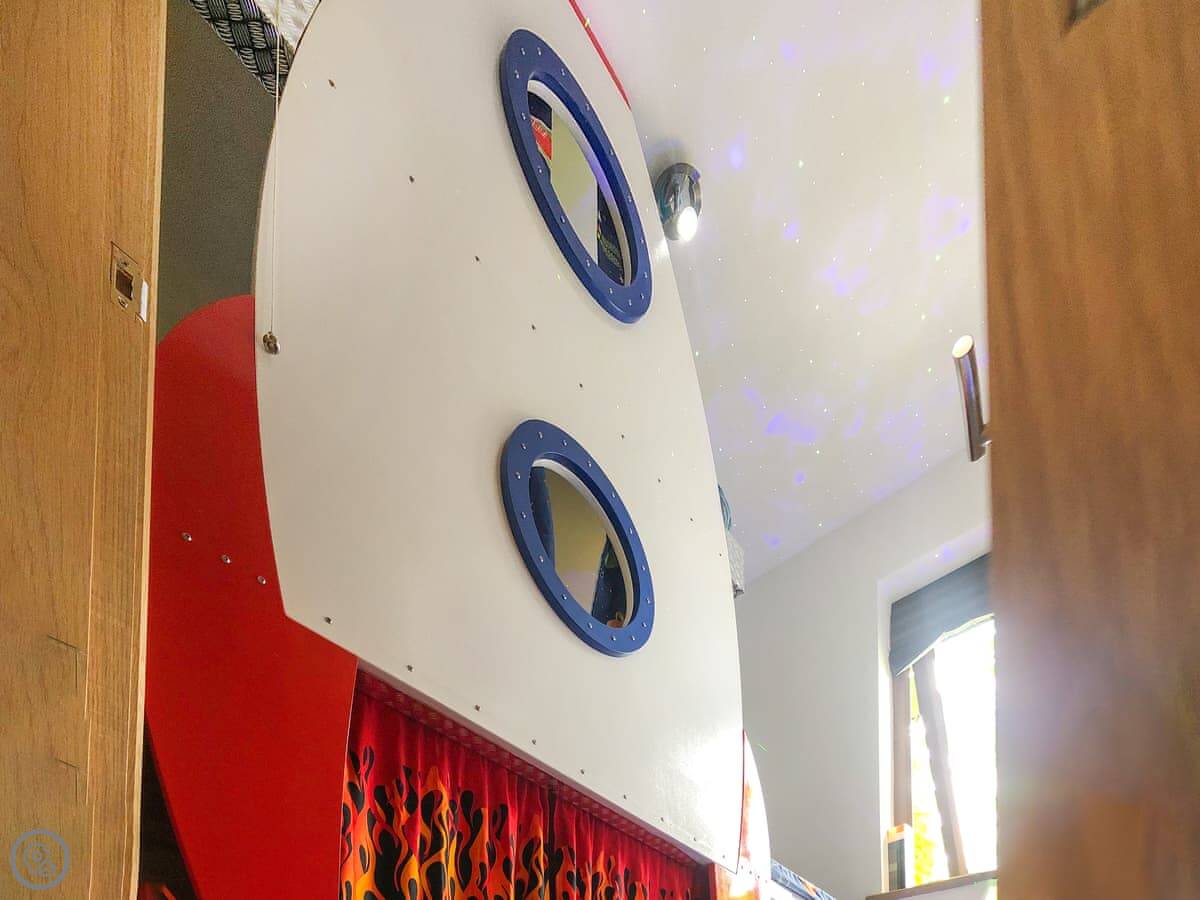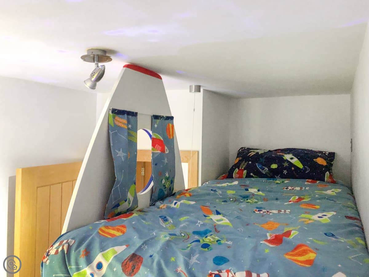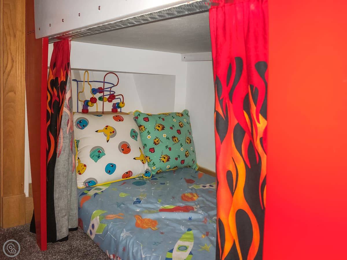Inside, it’s a normal family house. The kitchen has what you need. The living room has a gas fire. Upstairs, the main bedroom has a king-size bed, the second has a double, and the third has bunk beds for kids. The stairs are fine.
