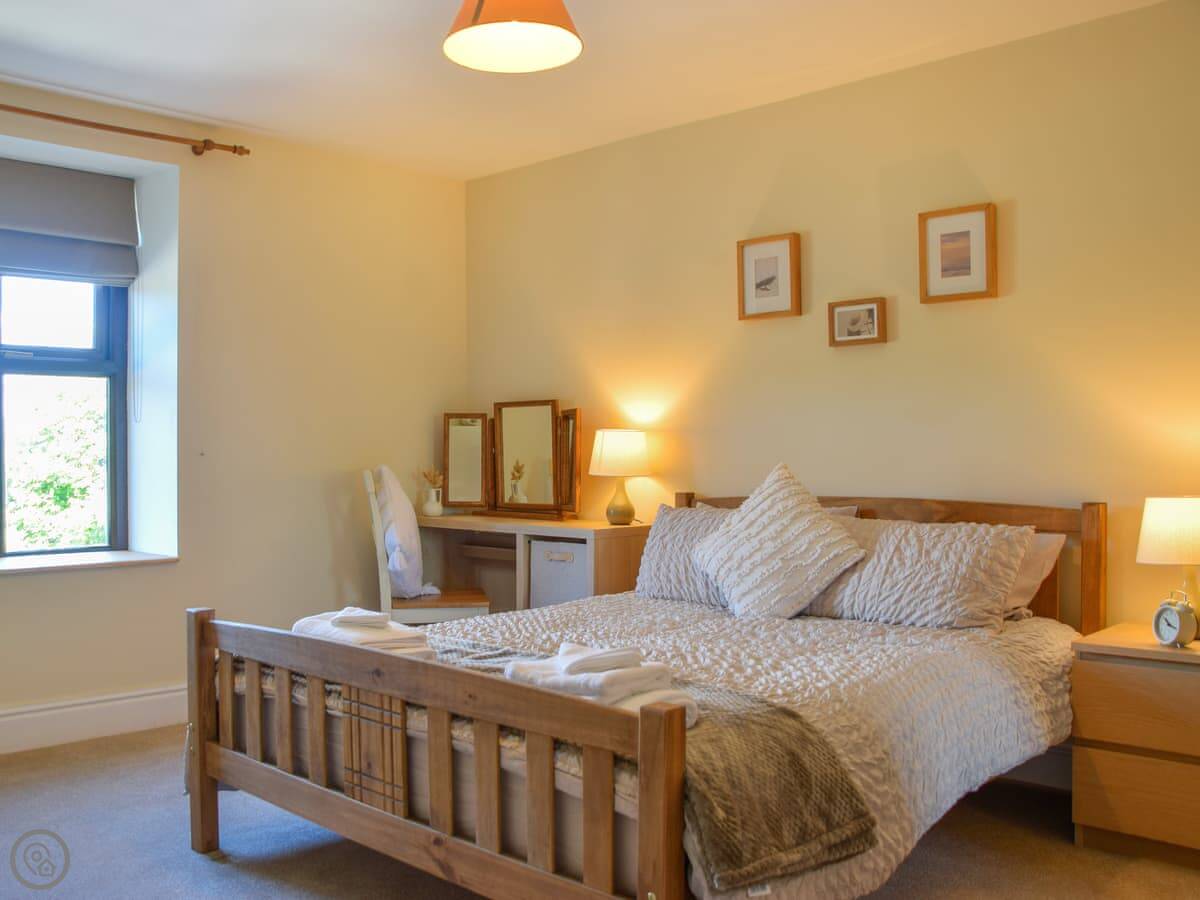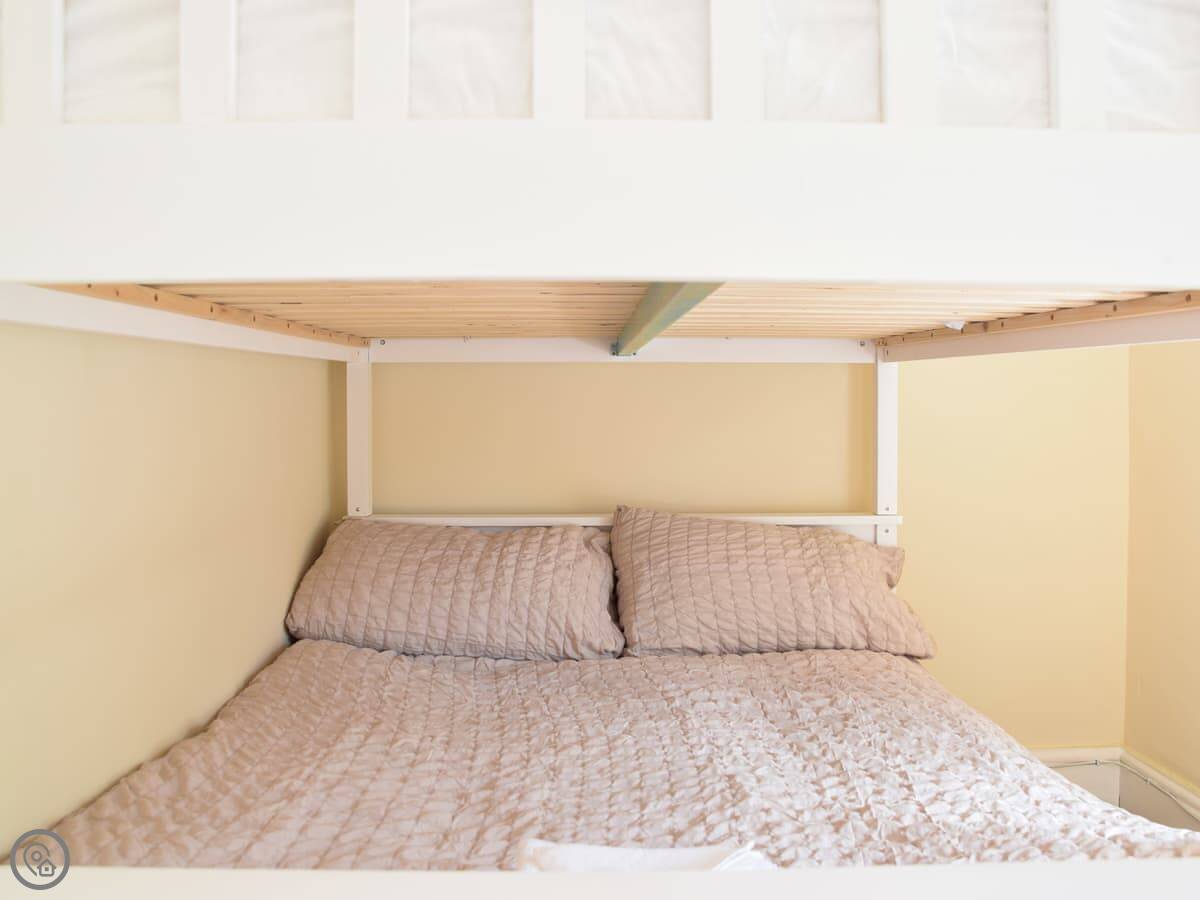 It sleeps four. Two bedrooms, one bathroom. There’s a kingsize in one room and the other has a double-over-double bunk bed. It’s rated 4 Star so it’s comfortable and everything works. The stairs are cottage stairs, so they’re steep.