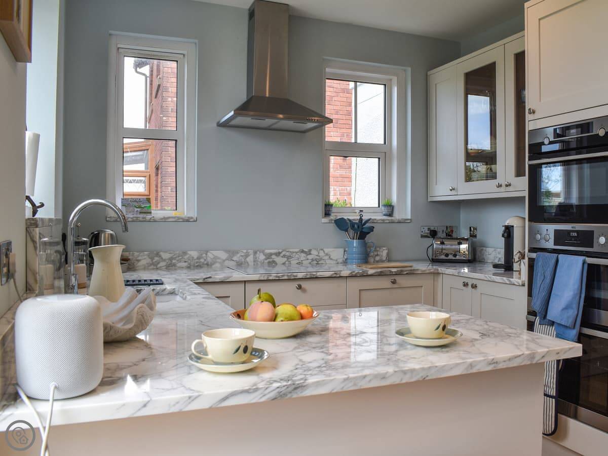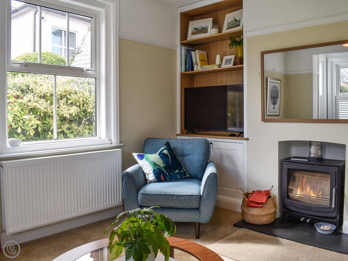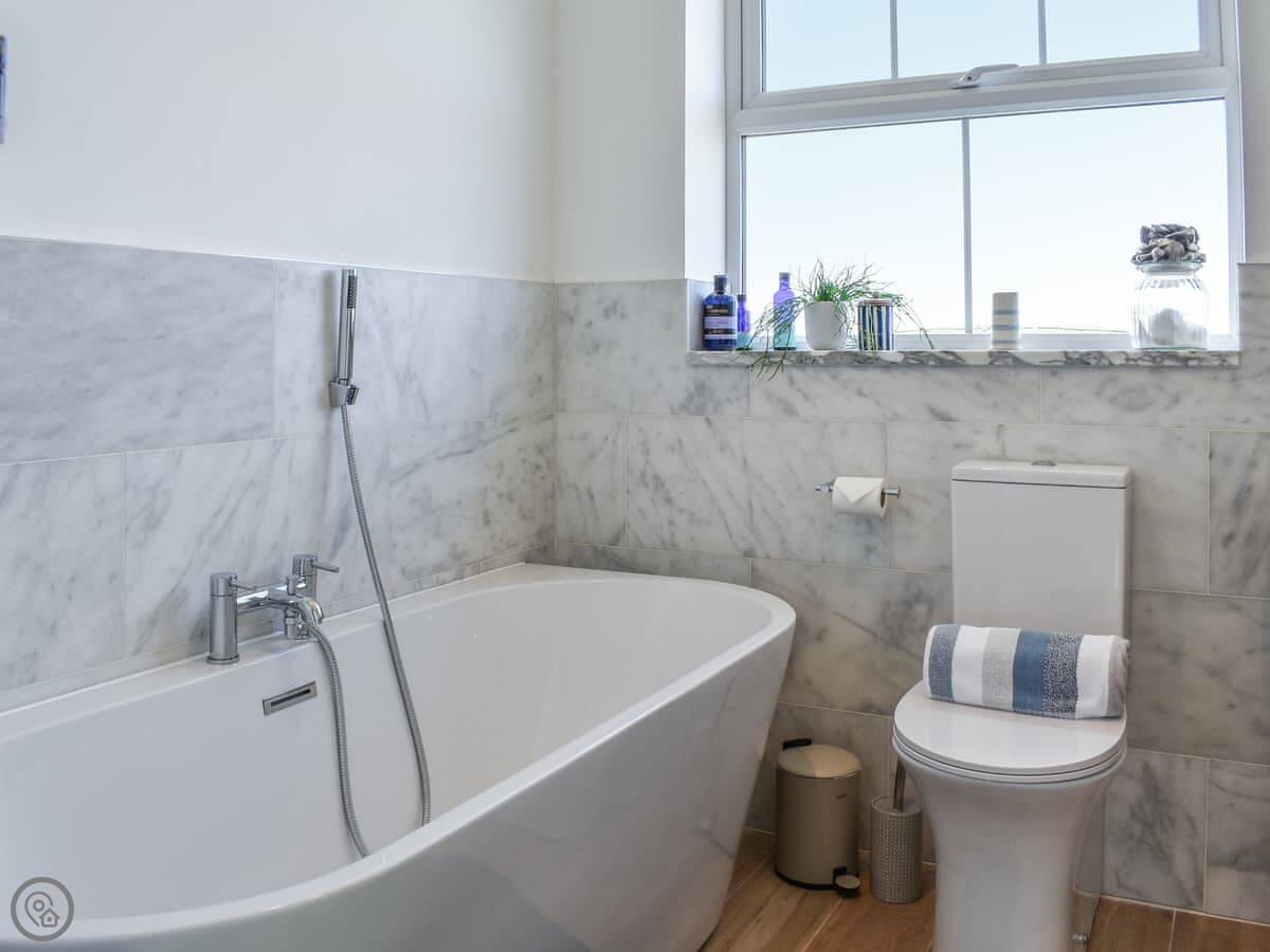 Inside, it's spacious. There are two living rooms, both with wood burners. The kitchen is open plan and has all the usual stuff – dishwasher, washing machine. The dining table fits everyone. There's one family bathroom upstairs with a bath and a separate shower.