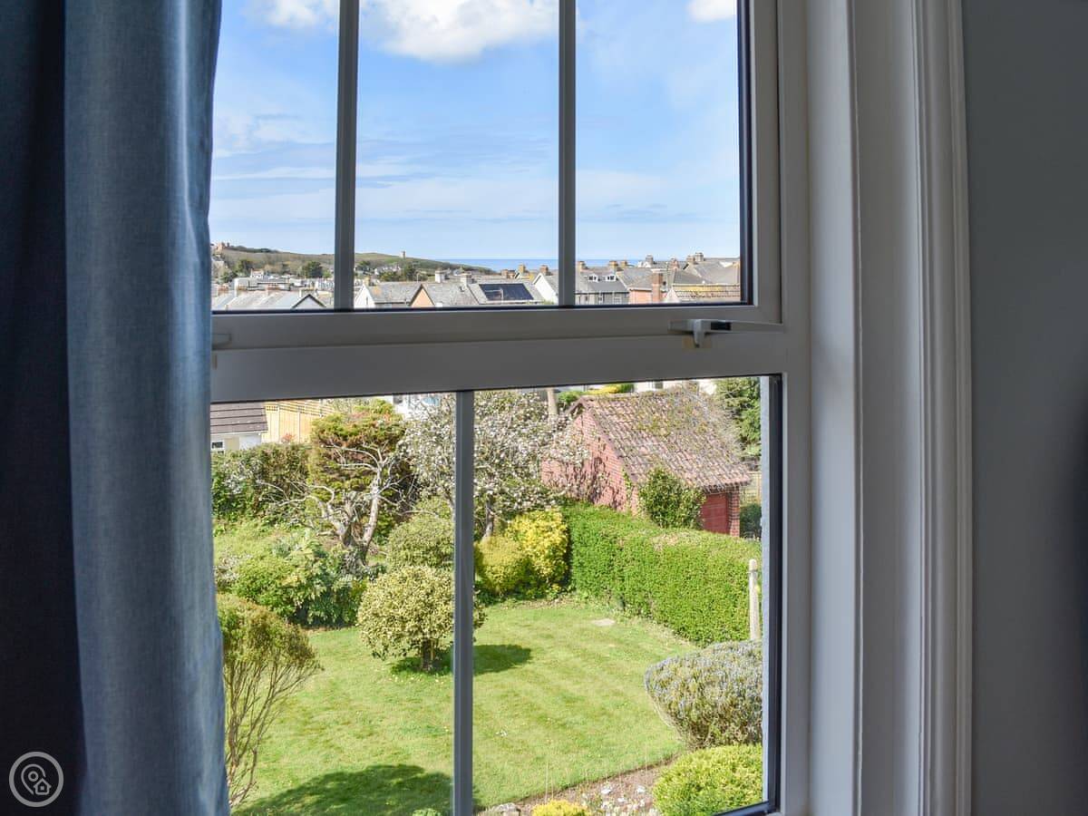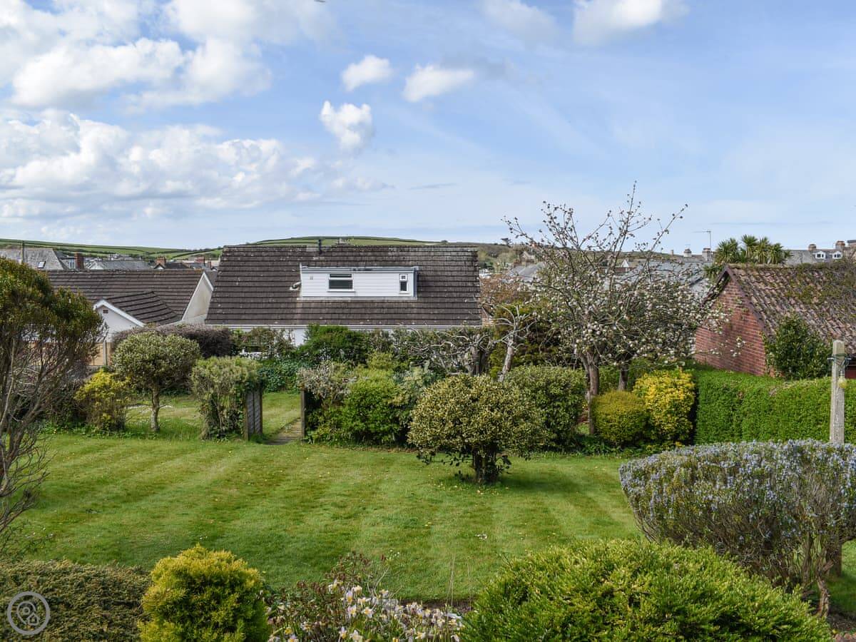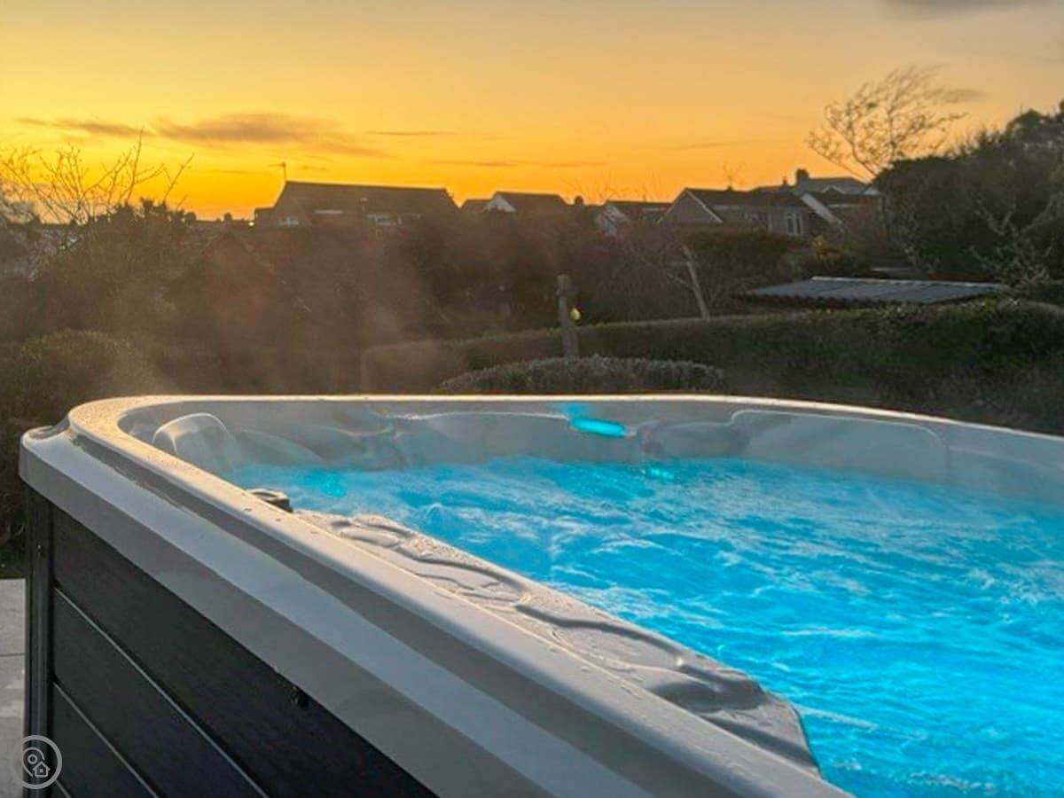 There's a big deck outside with a hot tub on it. The garden's below that, mostly lawn. There's also an outdoor shower, which is good for when you come back from the beach.