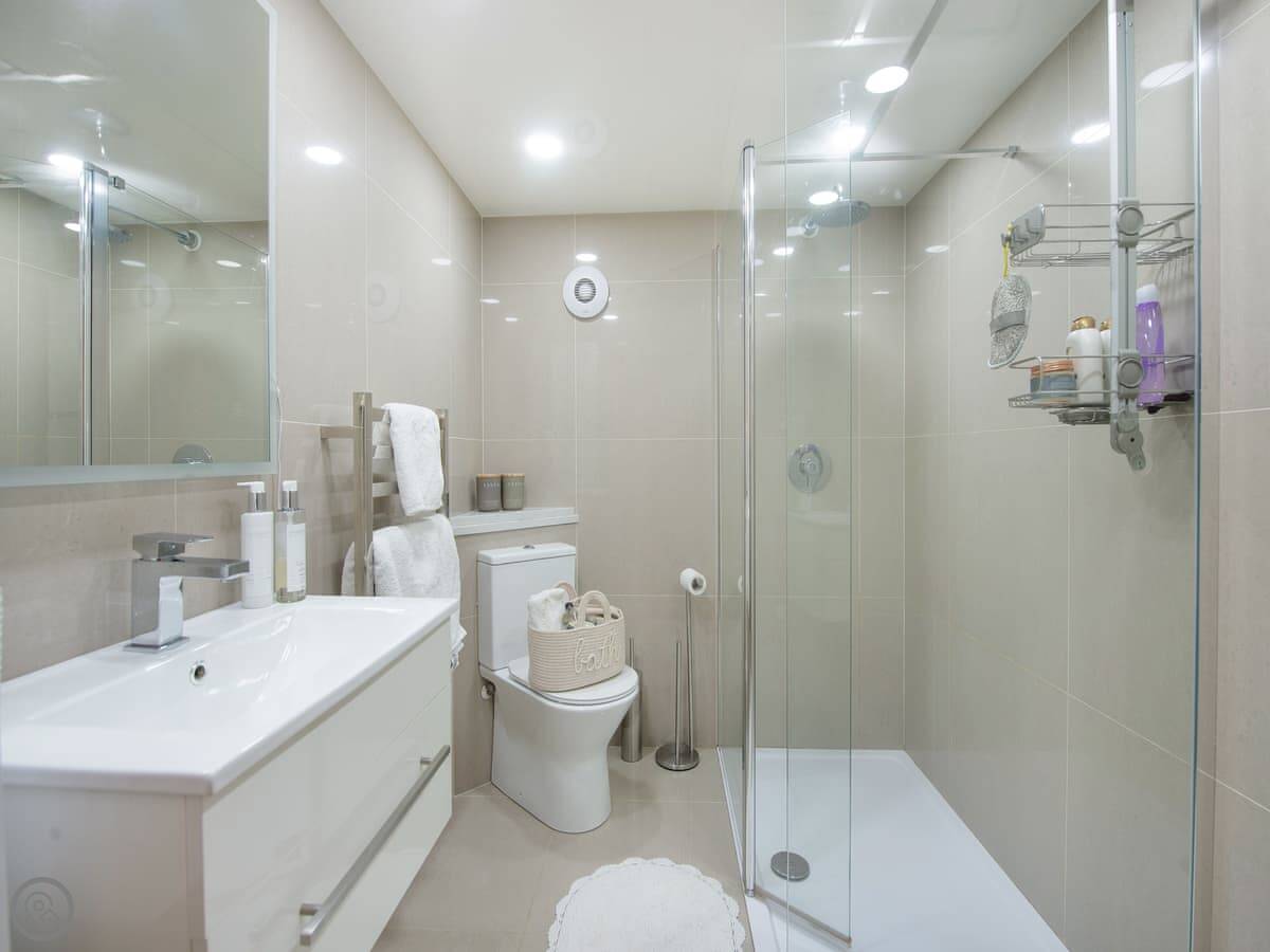 The place is all on one level. You've got an open plan living and kitchen area, with bifold doors out to the patio. There's a log burner for cooler nights. The bedroom has a TV, and there's a walk-in shower in the bathroom. Outside there's a private patio, a table and chairs, a barbecue, and a barrel sauna. There's also an electric vehicle charging point.
