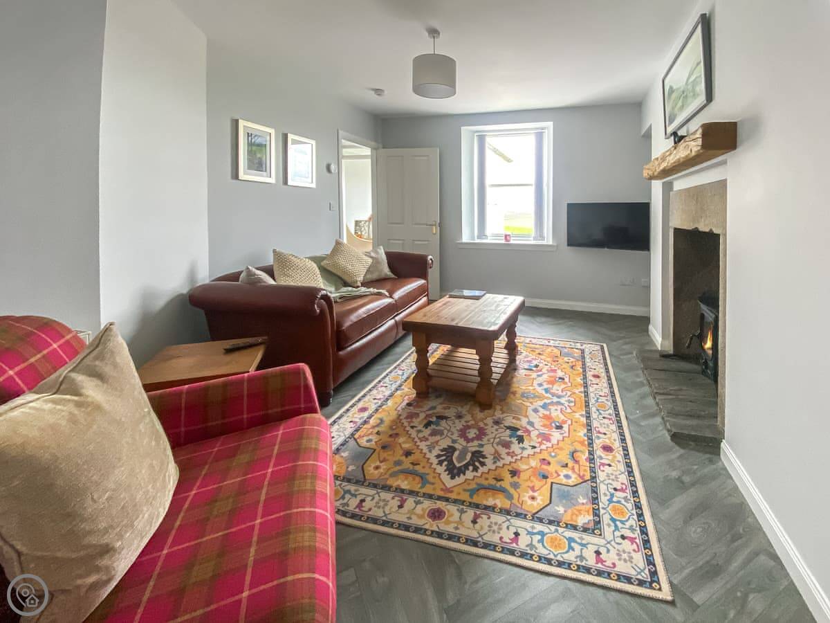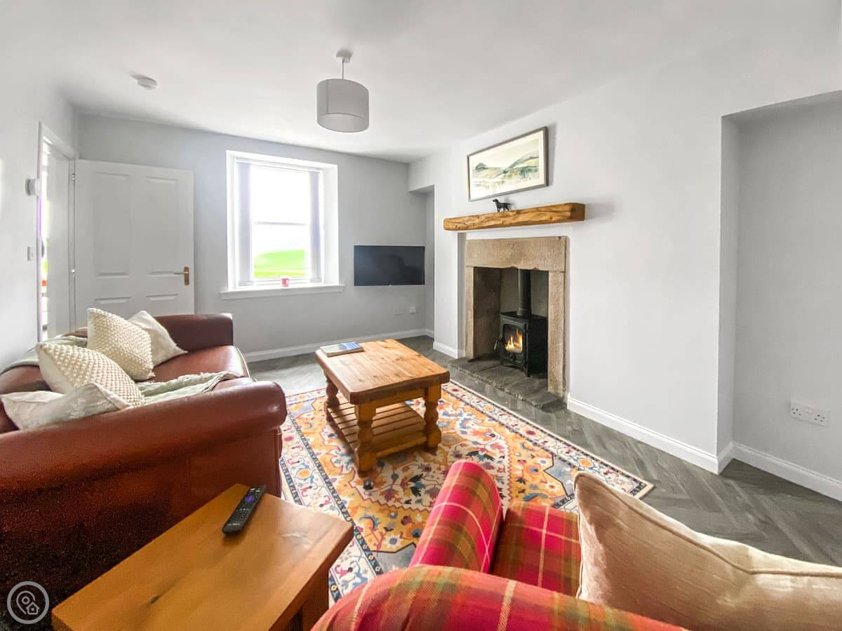 The kitchen has a dining table. The living room is separate and has a wood burner. We provide the first bag of logs. There's also a sunroom at the back. It gets the morning sun and looks out over the fields.