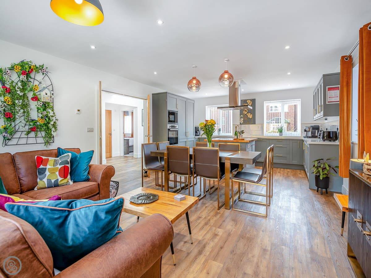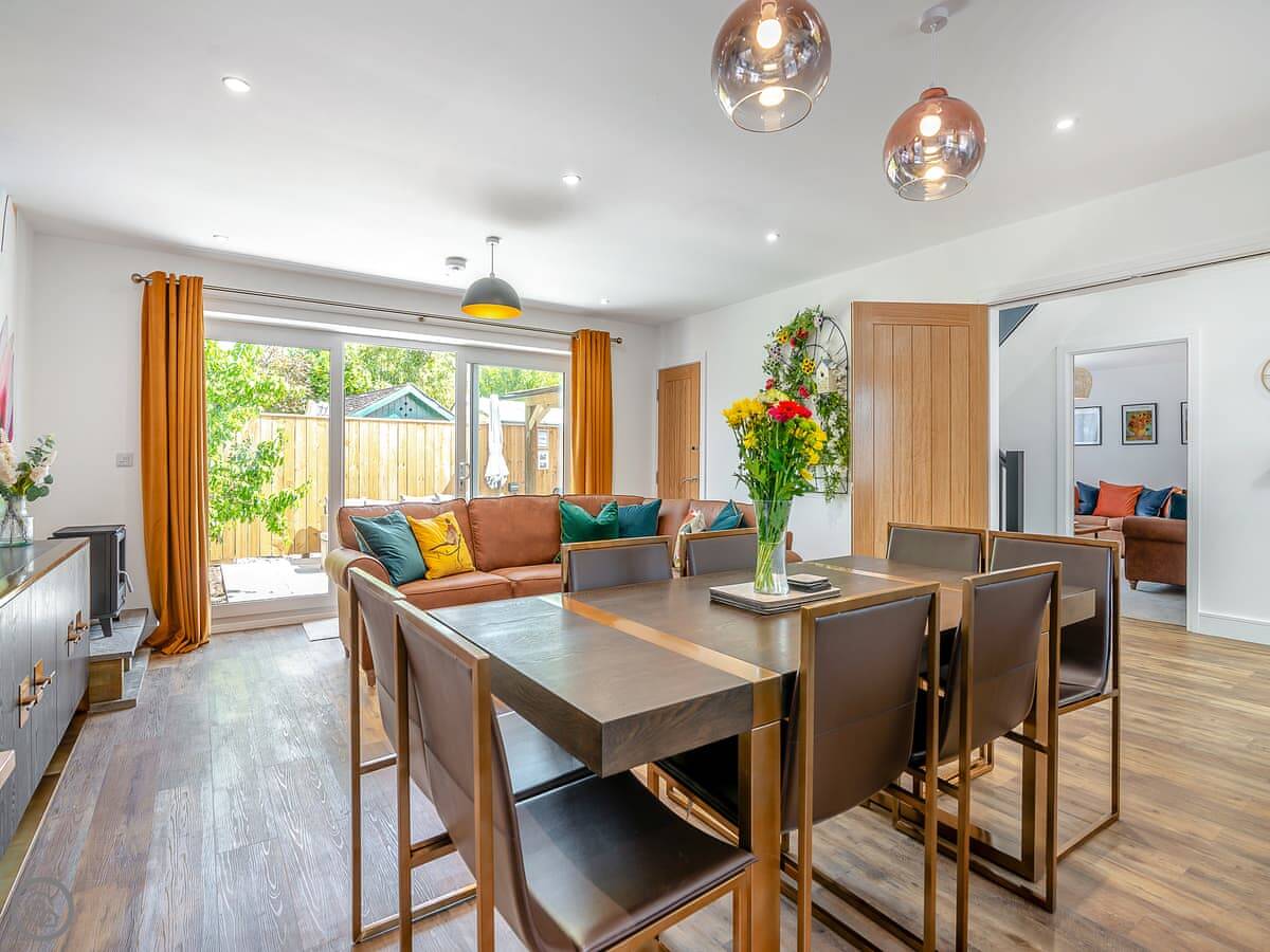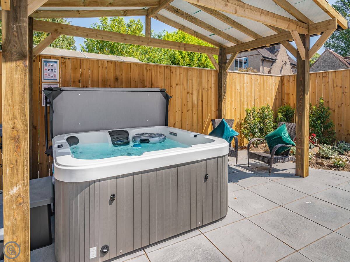 The rating is 5 Star, which means it's well-equipped and finished to a high standard. There's underfloor heating, a hot tub in the garden, and a wood burner in the main living area. All the bedrooms have their own TVs. One bedroom is on the ground floor with its own shower, which is handy.