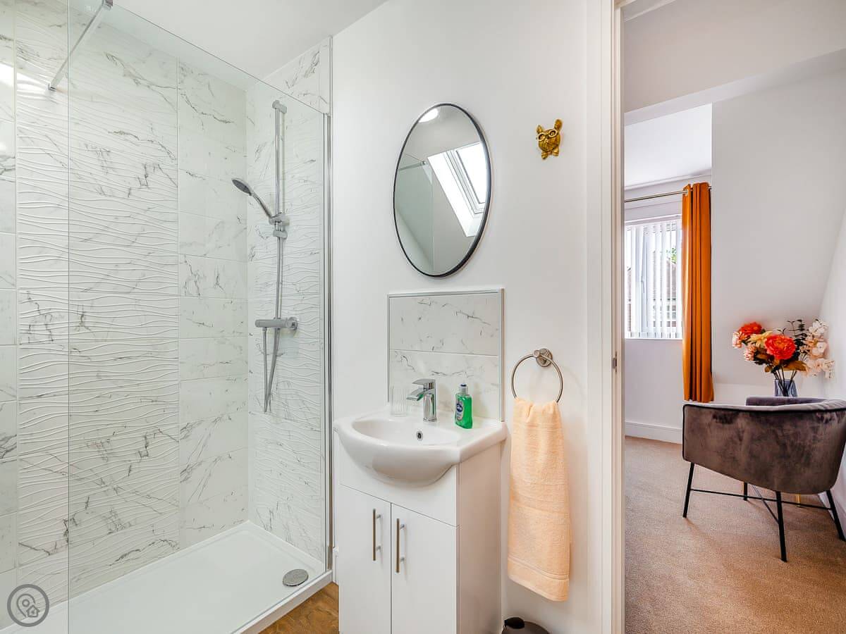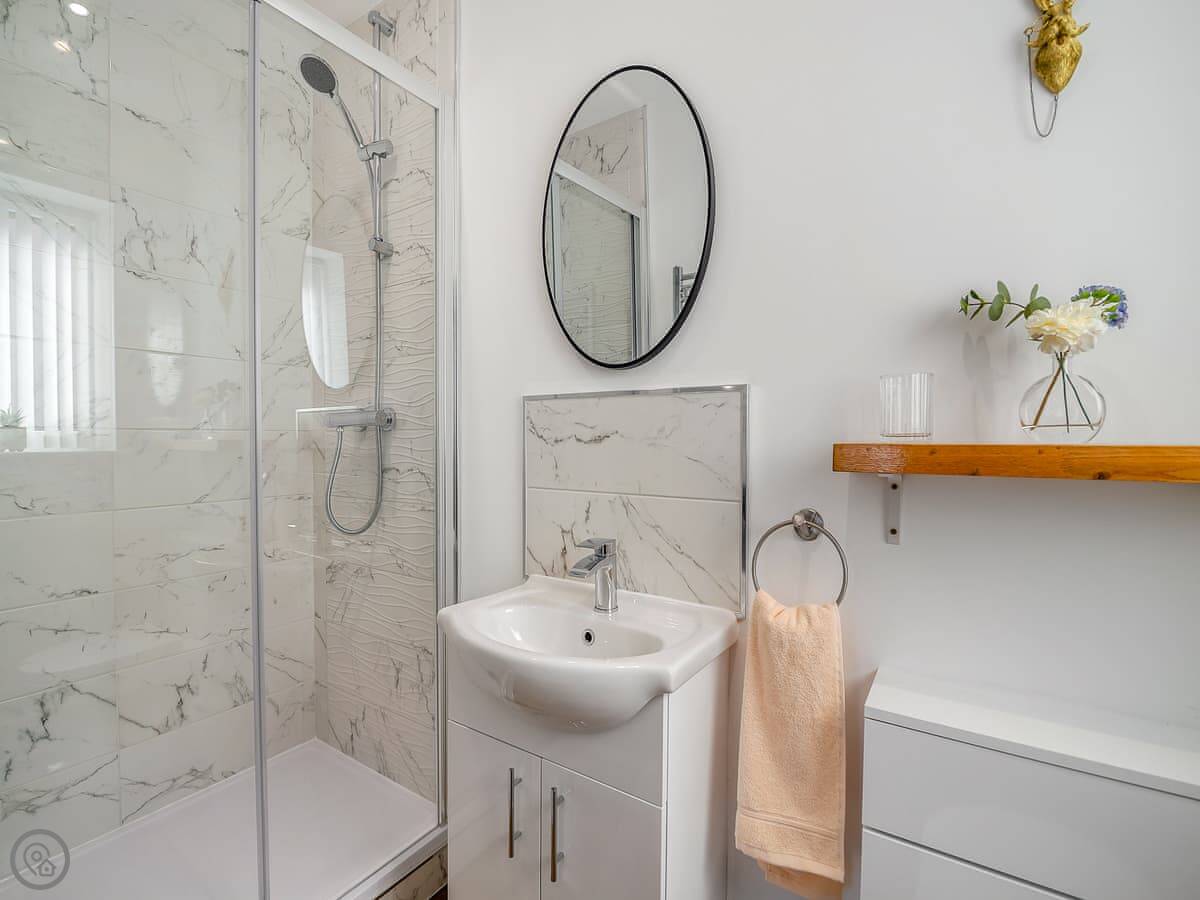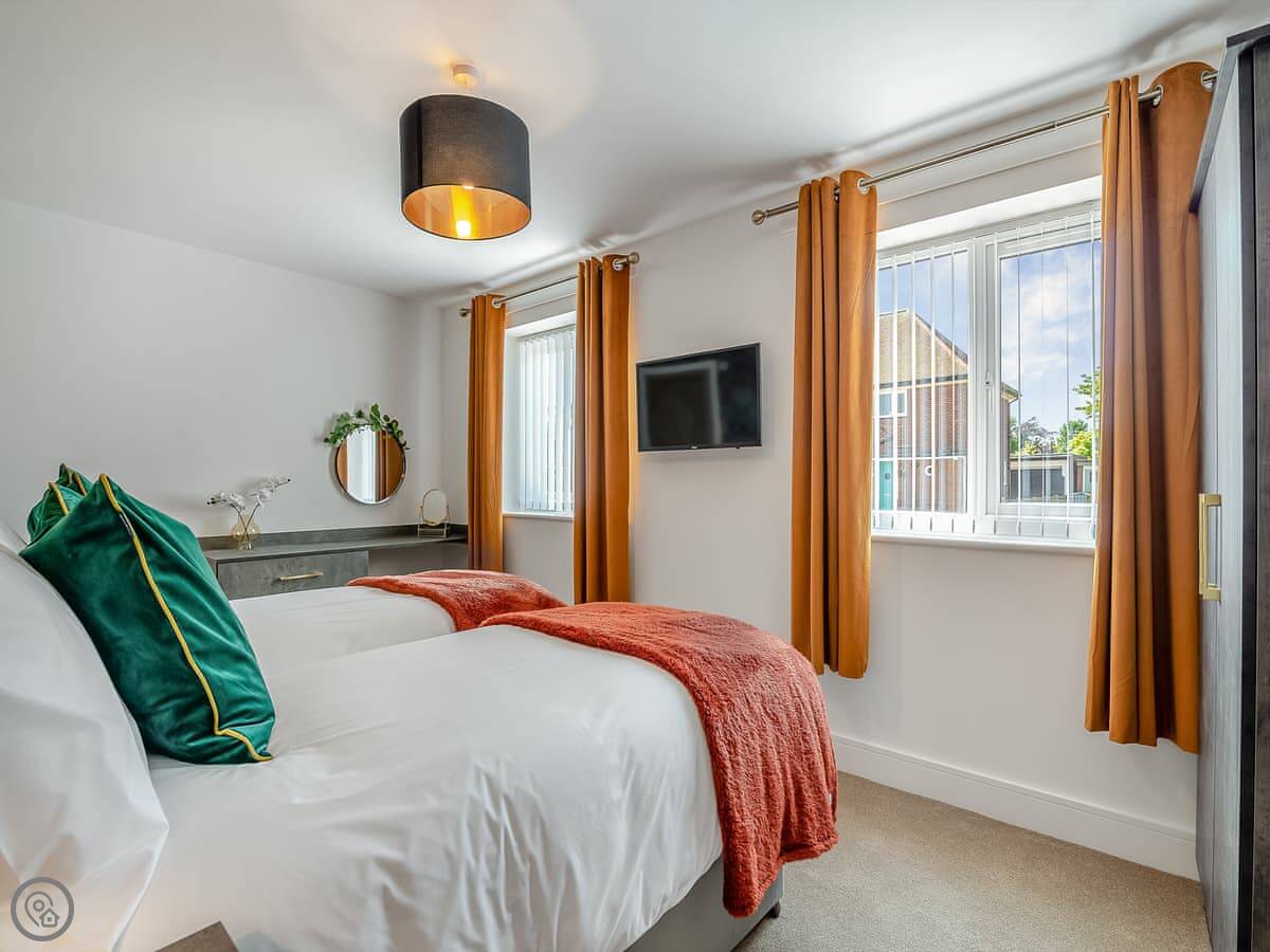The rating is 5 Star, which means it's well-equipped and finished to a high standard. There's underfloor heating, a hot tub in the garden, and a wood burner in the main living area. All the bedrooms have their own TVs. One bedroom is on the ground floor with its own shower, which is handy.