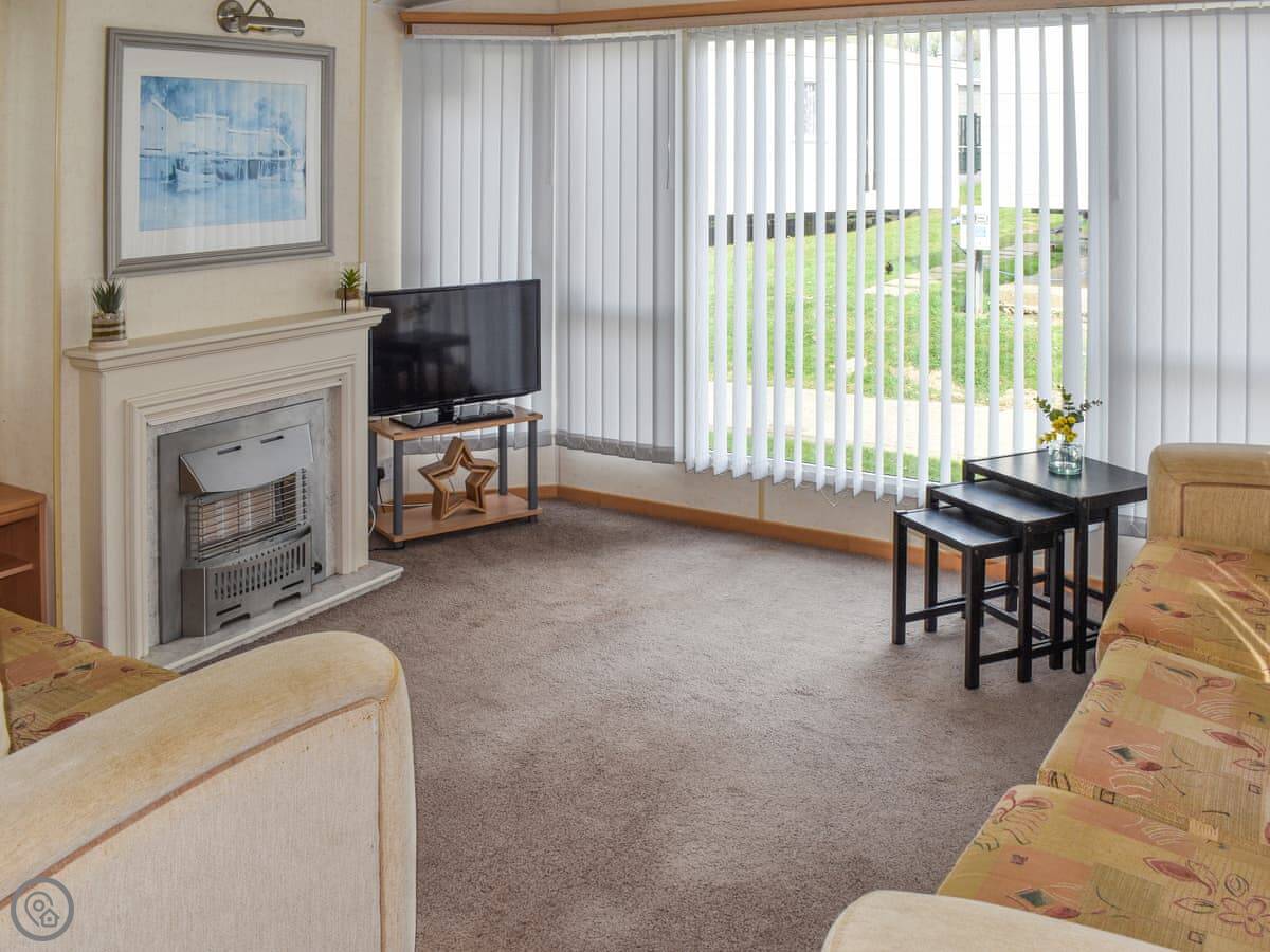 You've got your own space. The main living area is open plan, with the kitchen, dining table, and seating all together. There's a TV and a gas fire for cooler evenings. The bathroom has a shower.