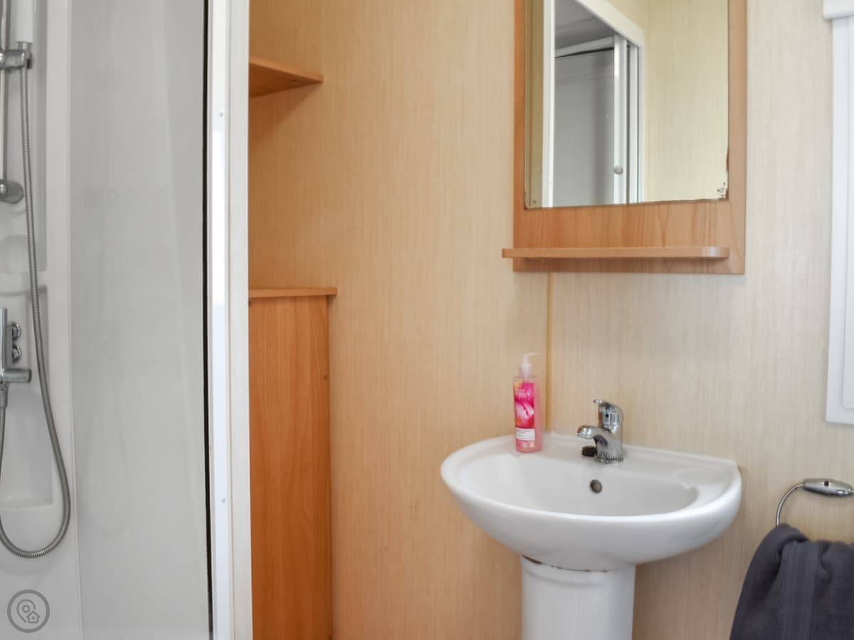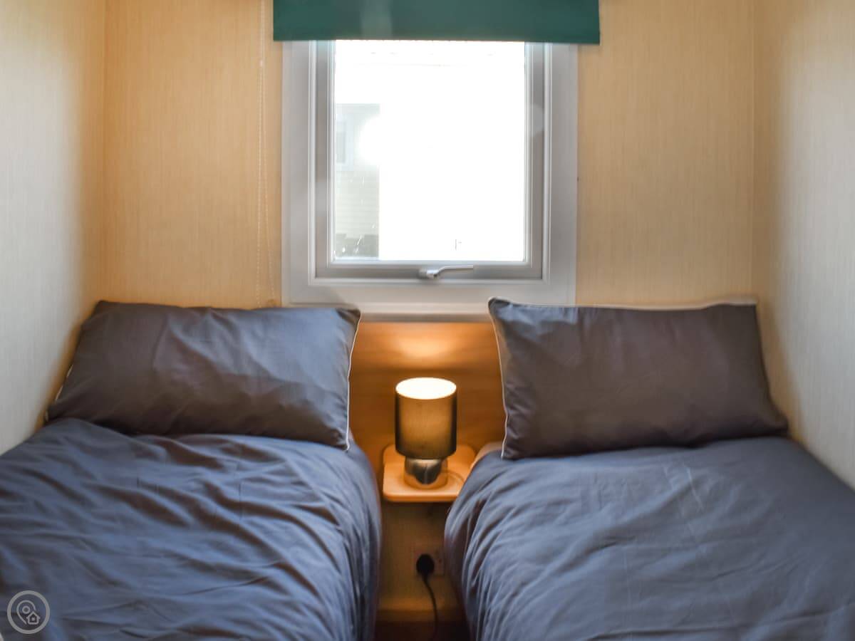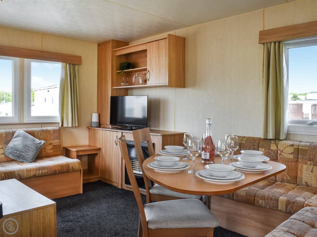 It sleeps eight. Three bedrooms and one shower room. There's also a separate toilet. One of the sofas in the lounge converts into a double bed. It's got a 3 Star rating, so it's clean and functional.