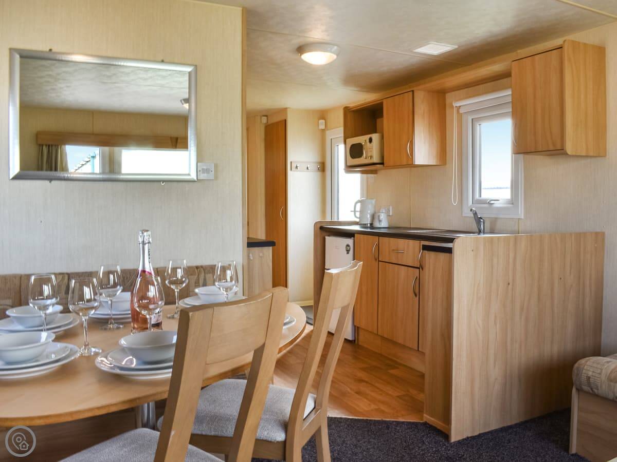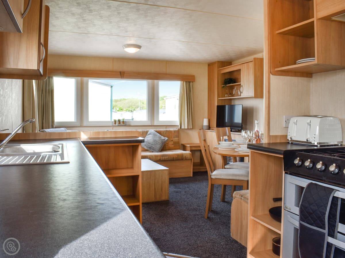Inside, it's open plan. The kitchen is a galley style, so it's a bit narrow. There's a gas fire in the lounge, a Smart TV, and WiFi. Bedding and towels are included. There's a washing machine.