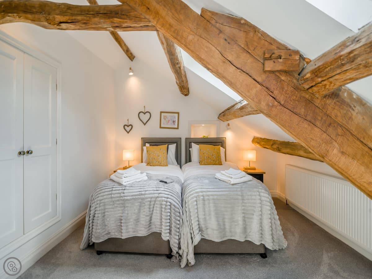 It sleeps six, in three bedrooms. Two of the bedrooms are super king size beds, the other is a twin. There are two bathrooms, one has just a shower. The stairs up to the top floor bedroom are quite steep, just so you know.