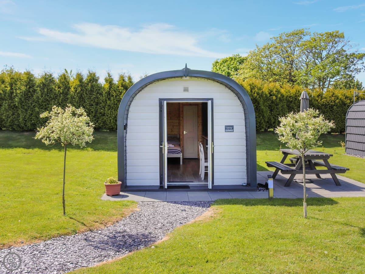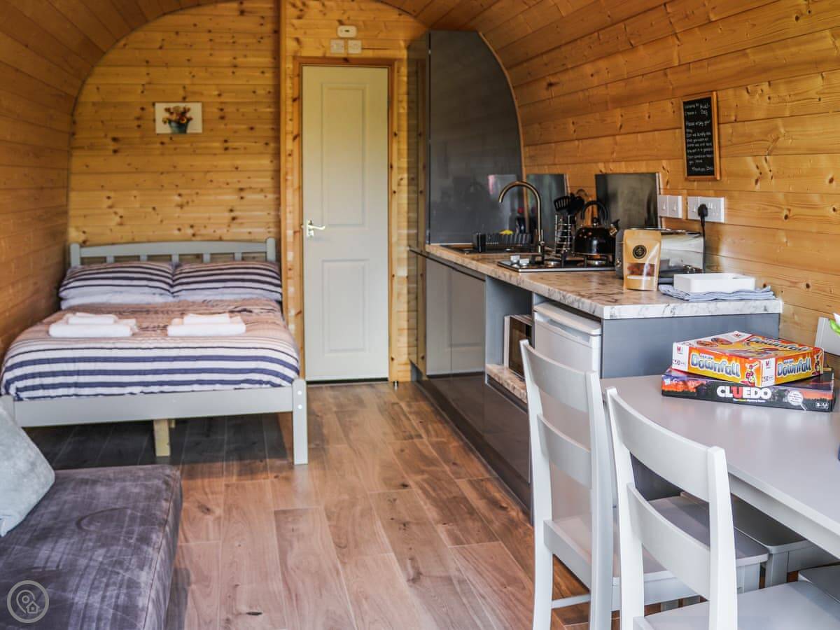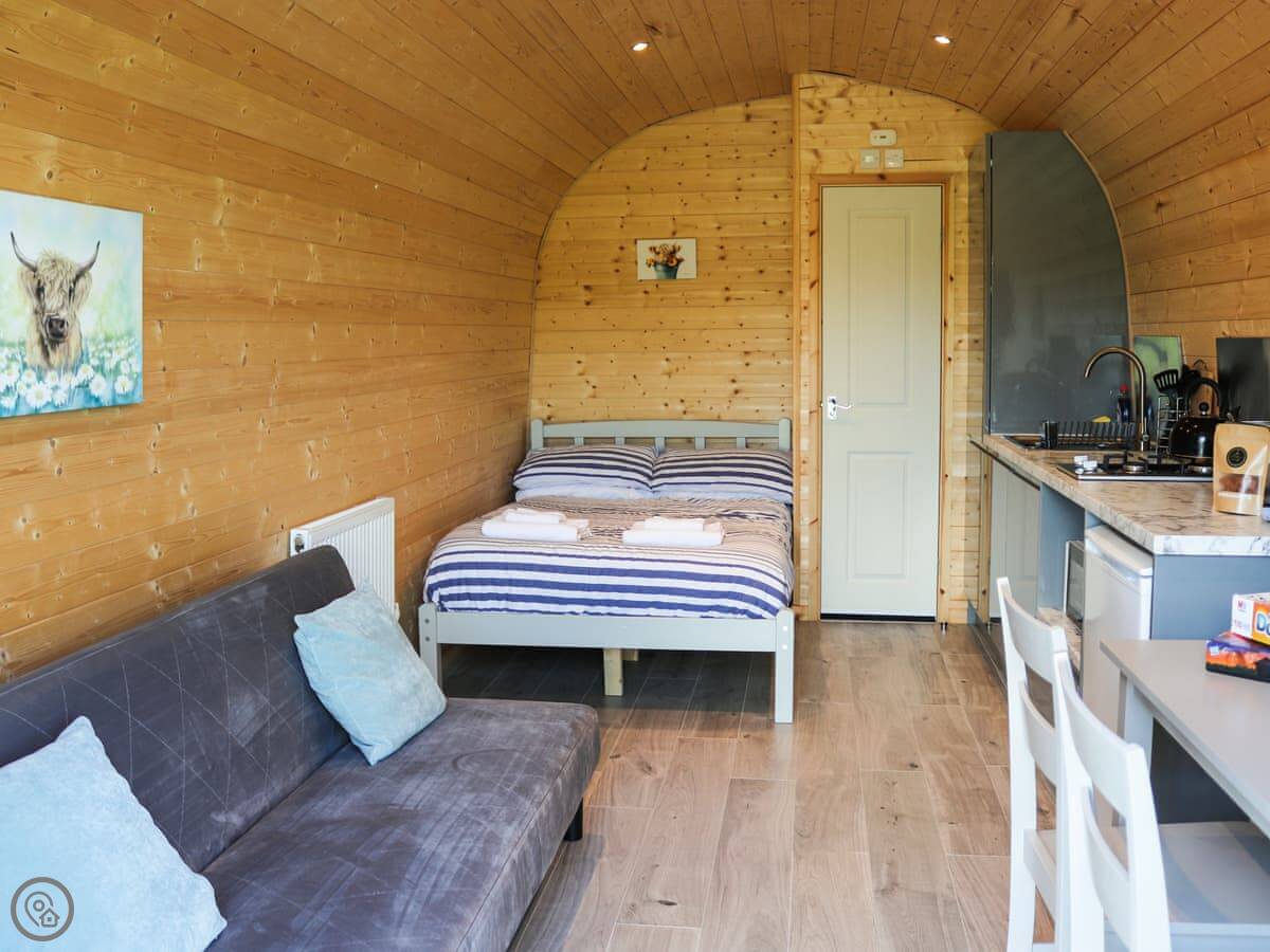 The property is called Awel Deg. It's a glamping pod in Brynsiencyn, a quiet village on Anglesey. There are four pods in a row, but they're detached so you get your own space. It's compact, sleeps four in total. There's a double bed and a sofa bed in the main room. It's got a 4 Star rating so it's well-equipped but naturally, it's all in one room.