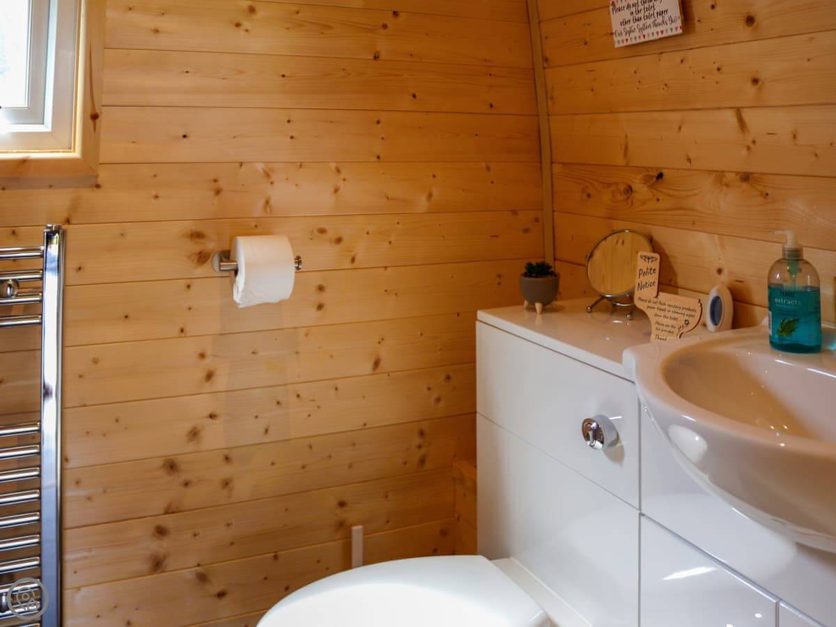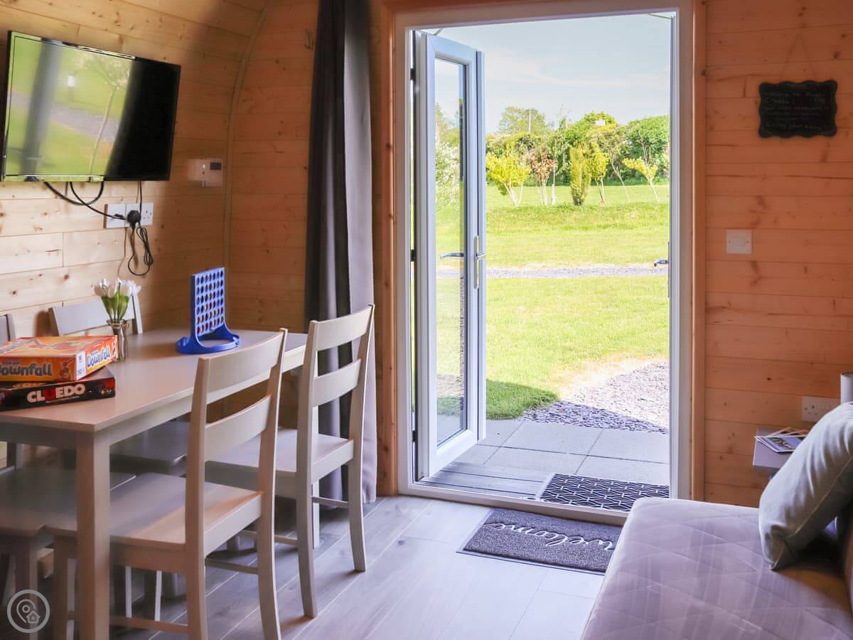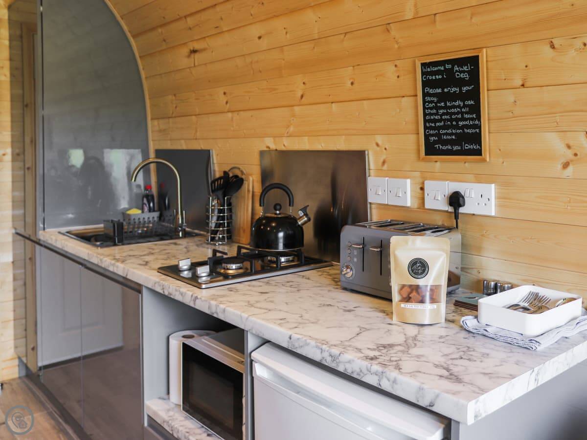 The property is called Awel Deg. It's a glamping pod in Brynsiencyn, a quiet village on Anglesey. There are four pods in a row, but they're detached so you get your own space. It's compact, sleeps four in total. There's a double bed and a sofa bed in the main room. It's got a 4 Star rating so it's well-equipped but naturally, it's all in one room.
