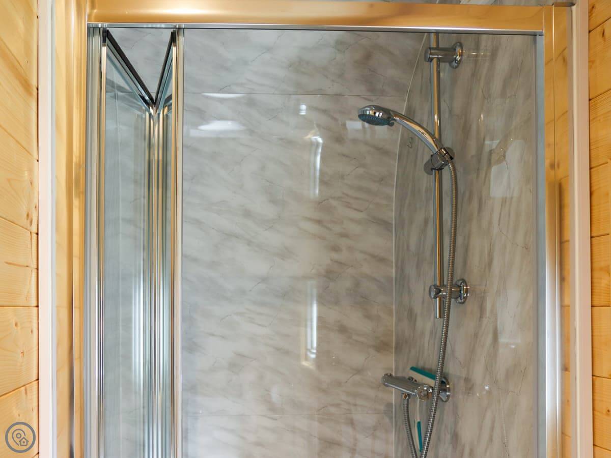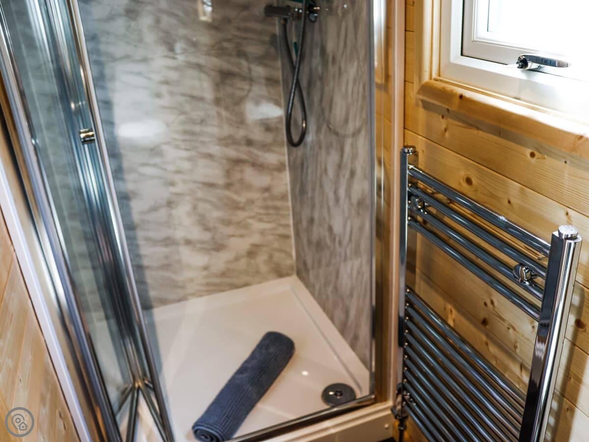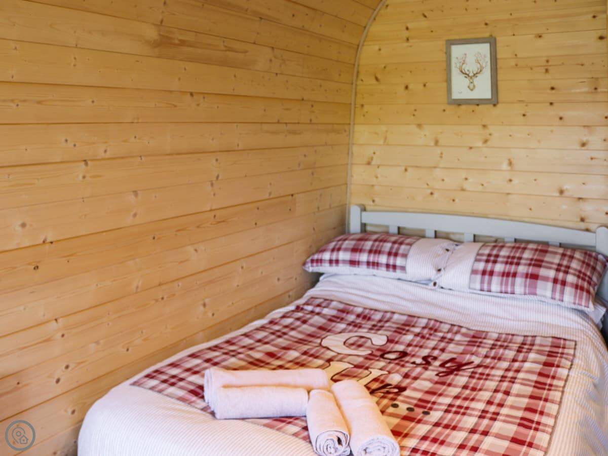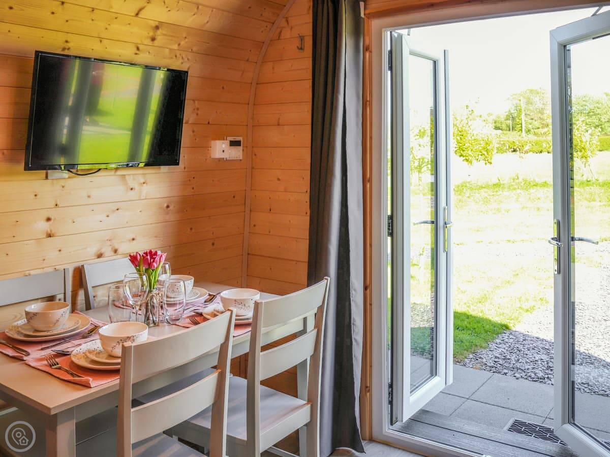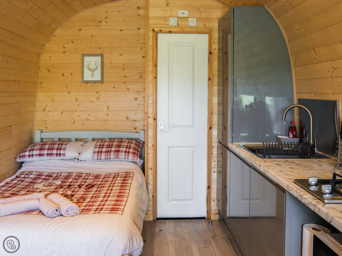 Inside, it's compact but clever. There's a small kitchen area with a hob and fridge, a shower room, and the beds. The TV has Freeview and there's WiFi. All bedding and towels are included. Parking is right next to your pod.