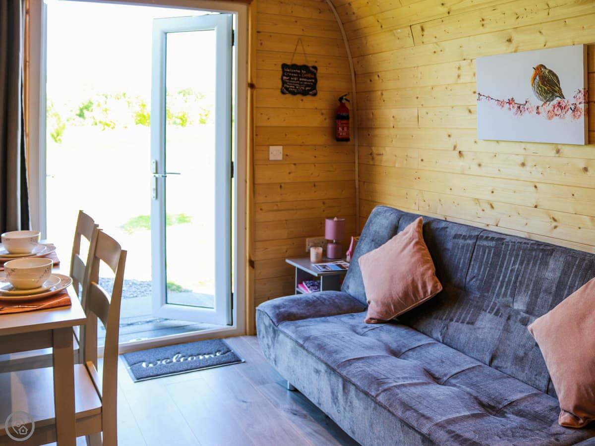 Cuddfan is one of four glamping pods on a site just outside Brynsiencyn village on Anglesey. It's a single open plan unit, so you're all in one room. There's a double bed and a sofa bed, so it says it sleeps four but that's really two adults and two kids, maximum. It's got the 4 Star rating because it's well finished and has everything you need.