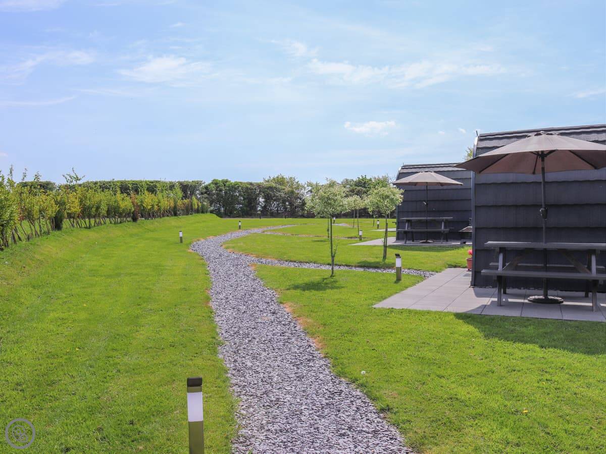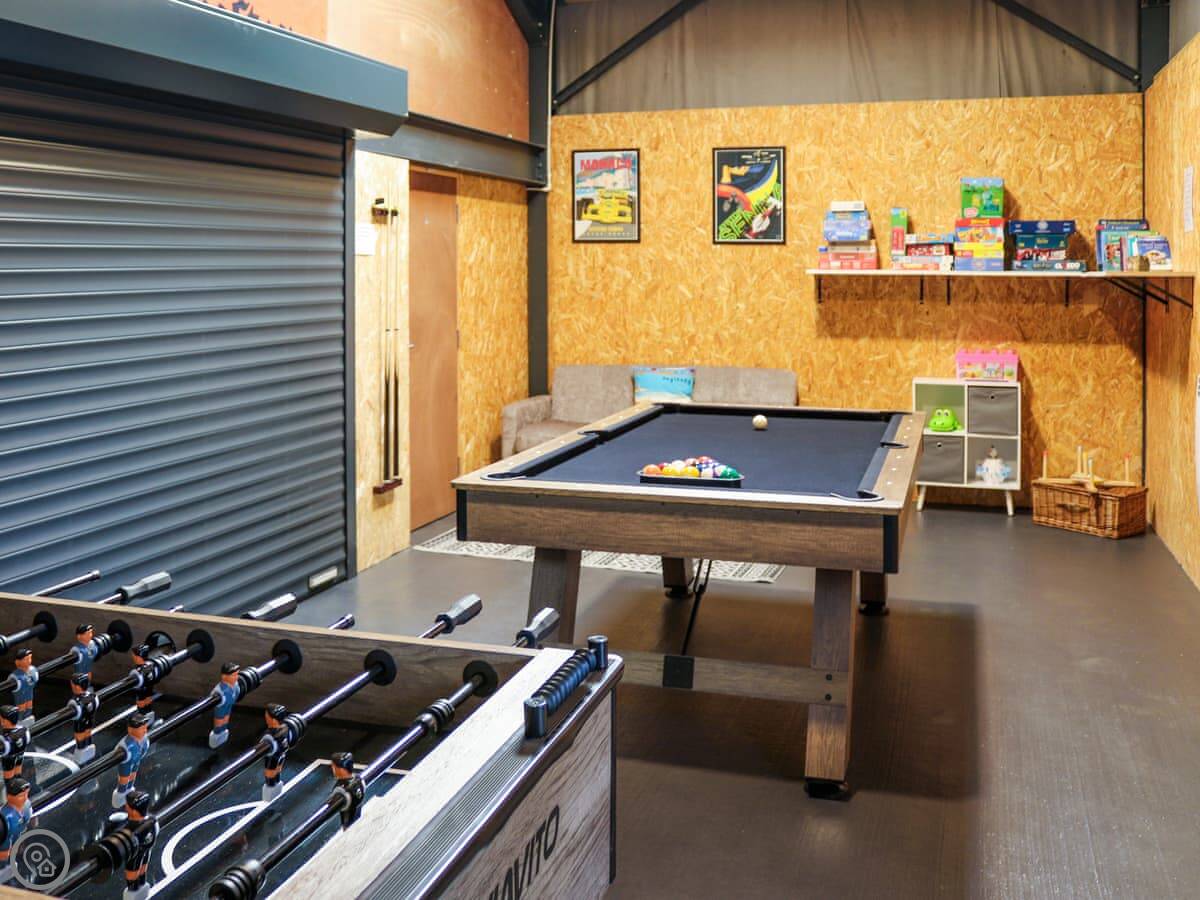 The pod itself is detached and you have your own little patio area with a picnic bench and a firepit. There's a patch of grass out front that's yours too, and then a big shared field where kids can run about. The games room is shared between the four pods. It's got a pool table, table football, and some books and games.