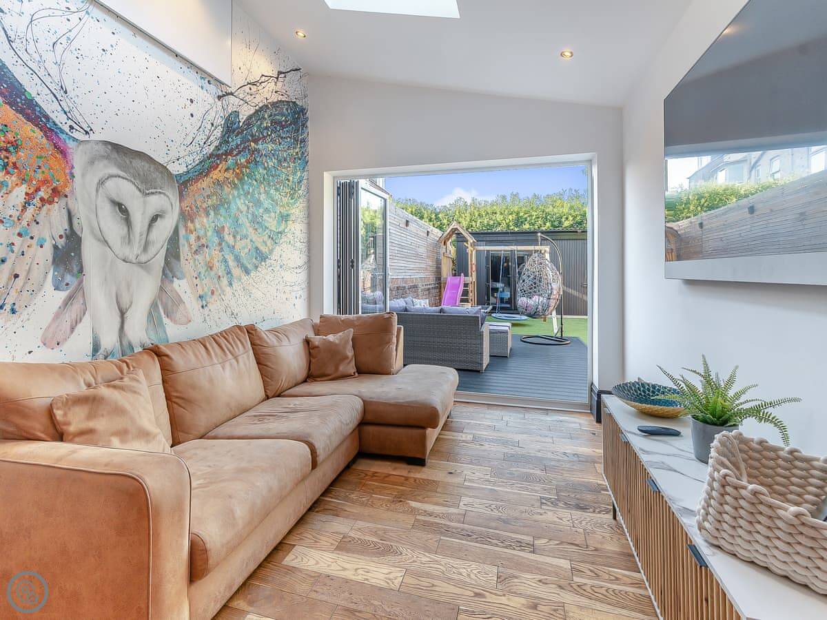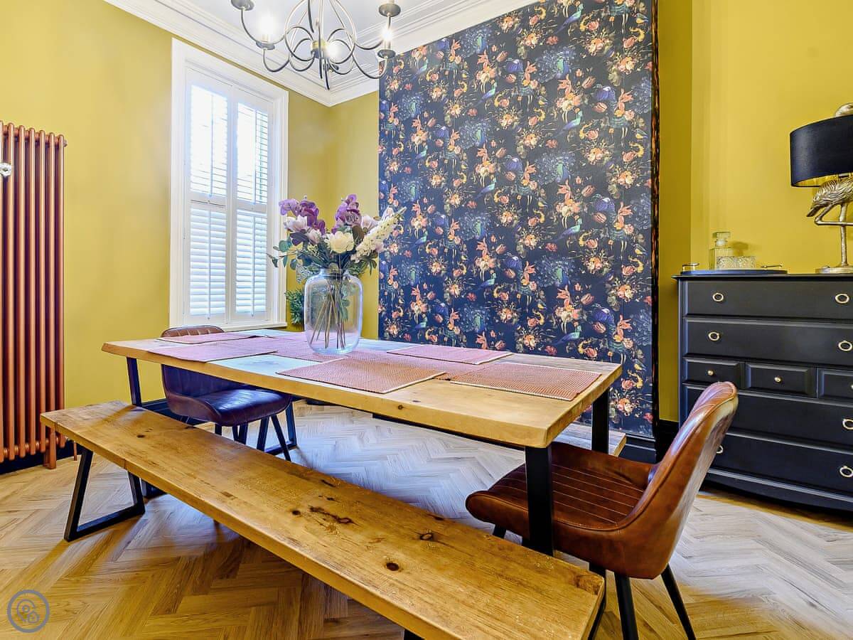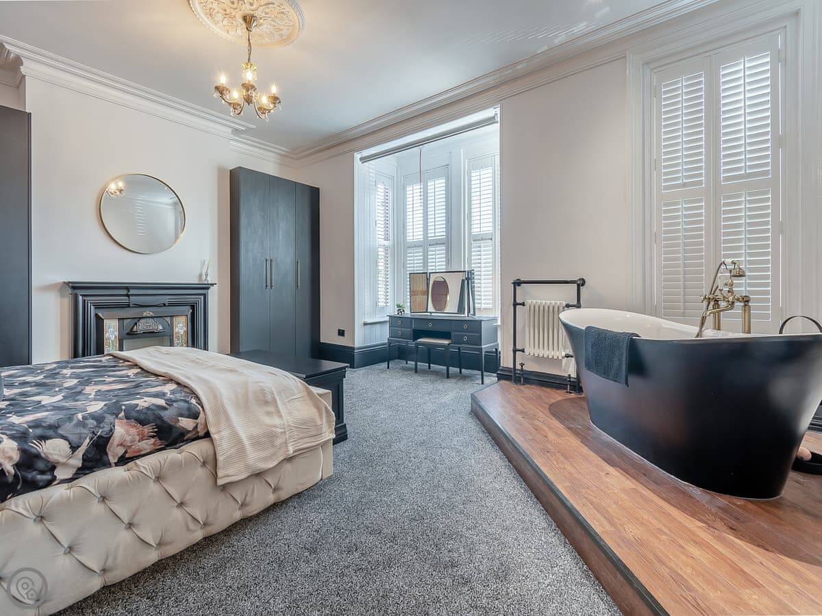 Inside, the rooms are big with high ceilings. There's a front living room with a wood burner, a separate dining room, and a kitchen at the back that opens into another sitting area. On the first floor, the main bedroom has a freestanding bath in it and a projector screen on the wall. The family bathroom on that floor is a shower room.
