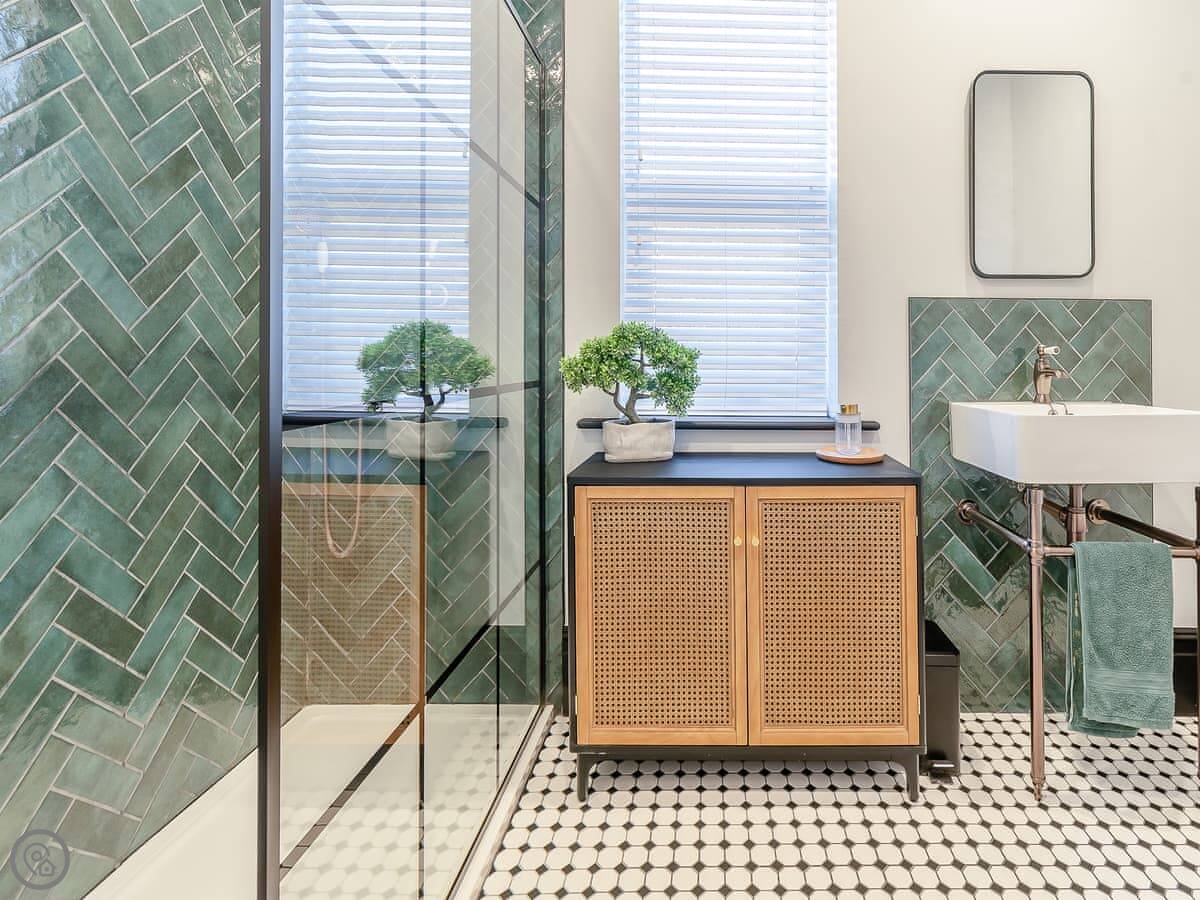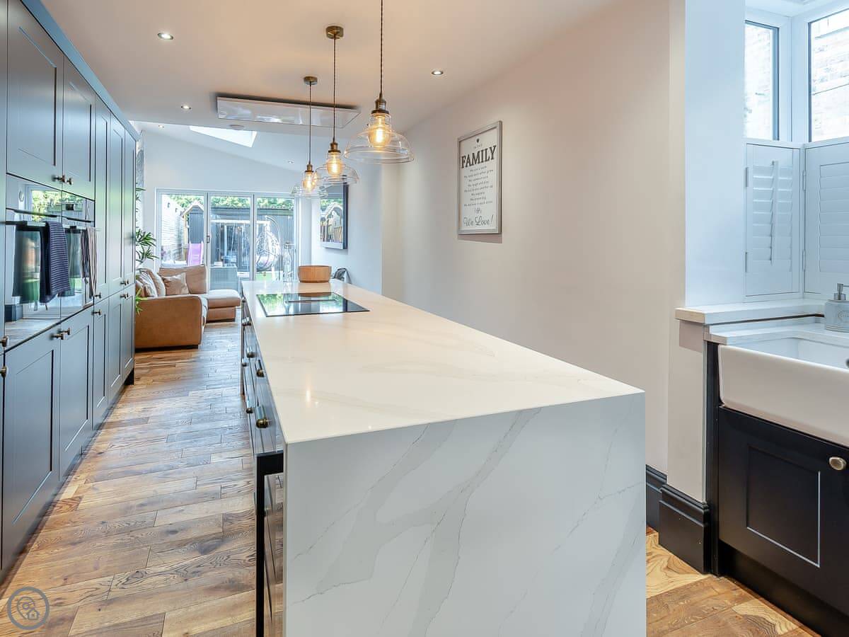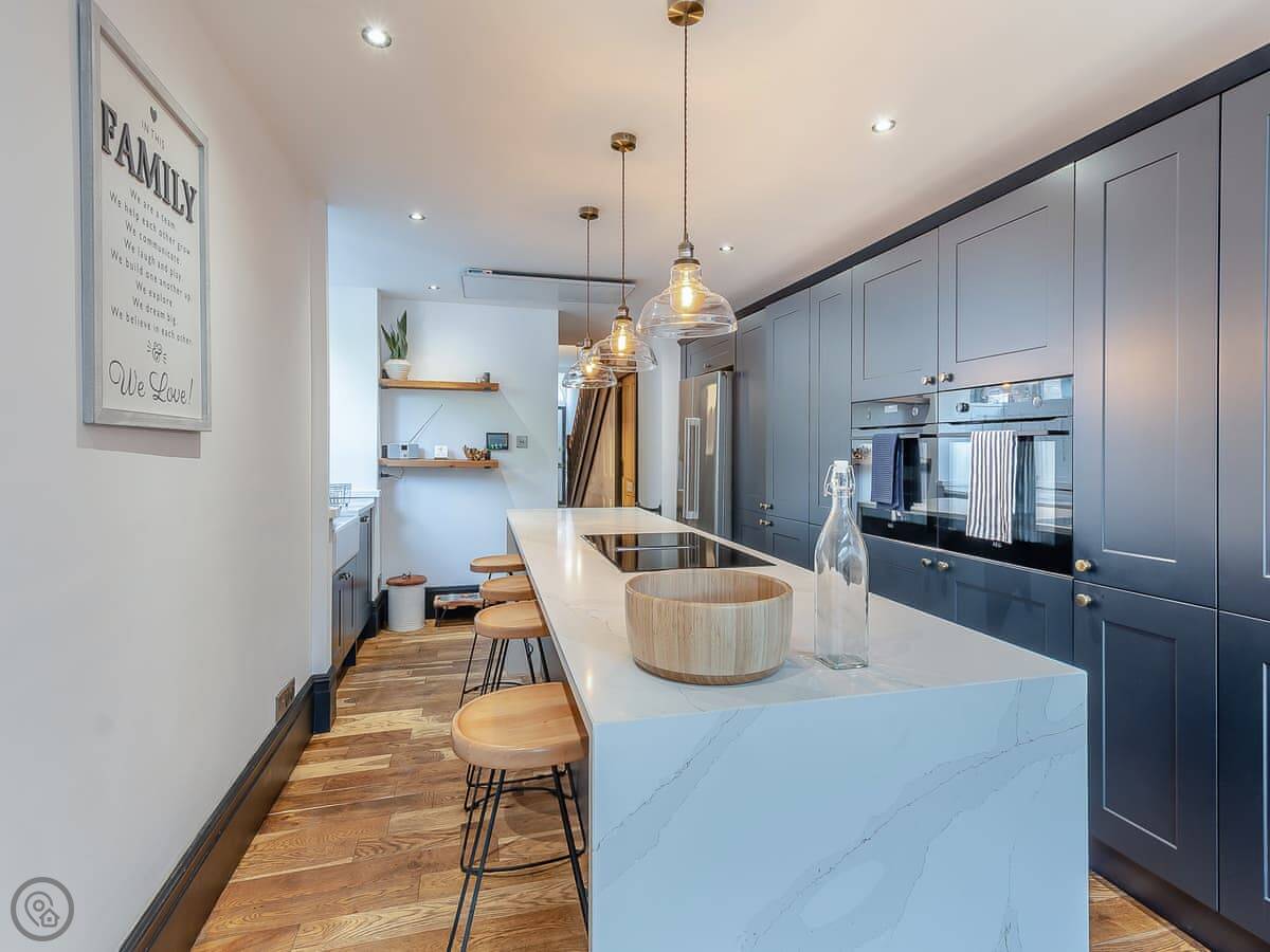 Inside, the rooms are big with high ceilings. There's a front living room with a wood burner, a separate dining room, and a kitchen at the back that opens into another sitting area. On the first floor, the main bedroom has a freestanding bath in it and a projector screen on the wall. The family bathroom on that floor is a shower room.