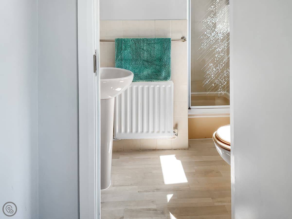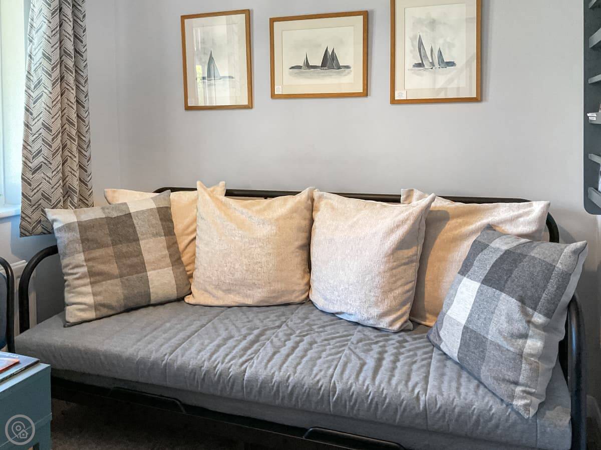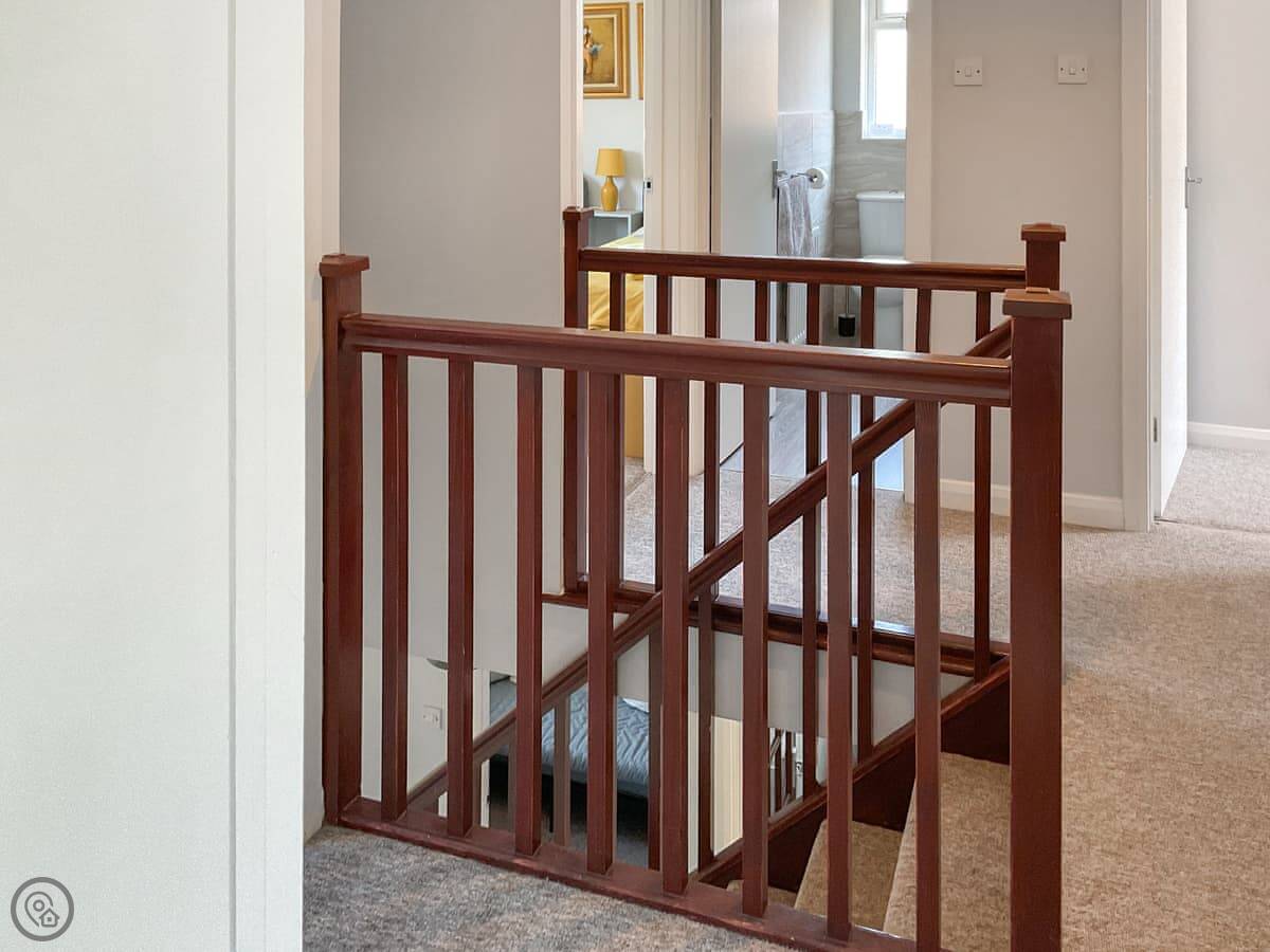 The house sleeps seven across four bedrooms. Two doubles and two singles, plus a put-you-up bed in one of the single rooms. There are two bathrooms, one with a shower cubicle and one with a bath. The stairs have a stairgate at the top.