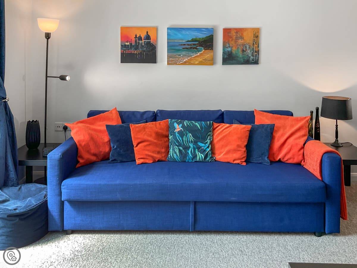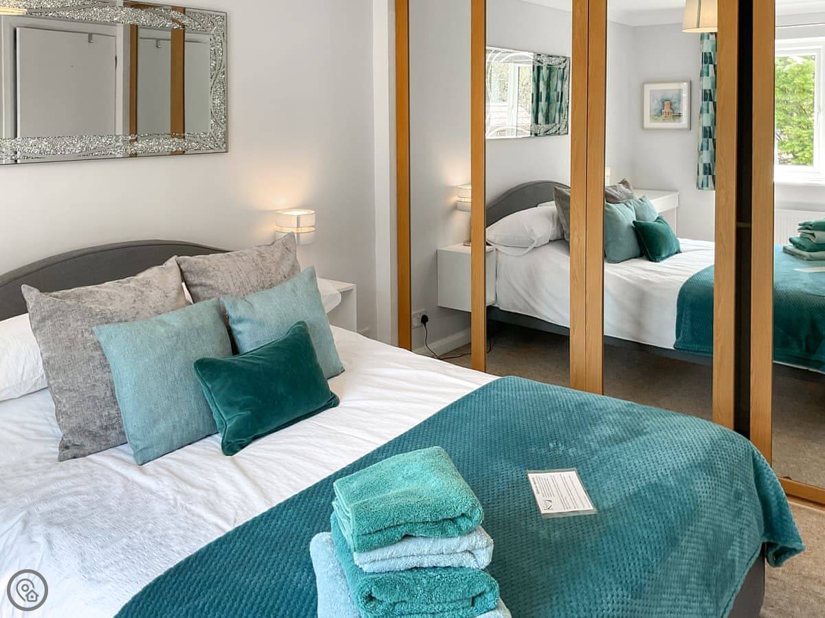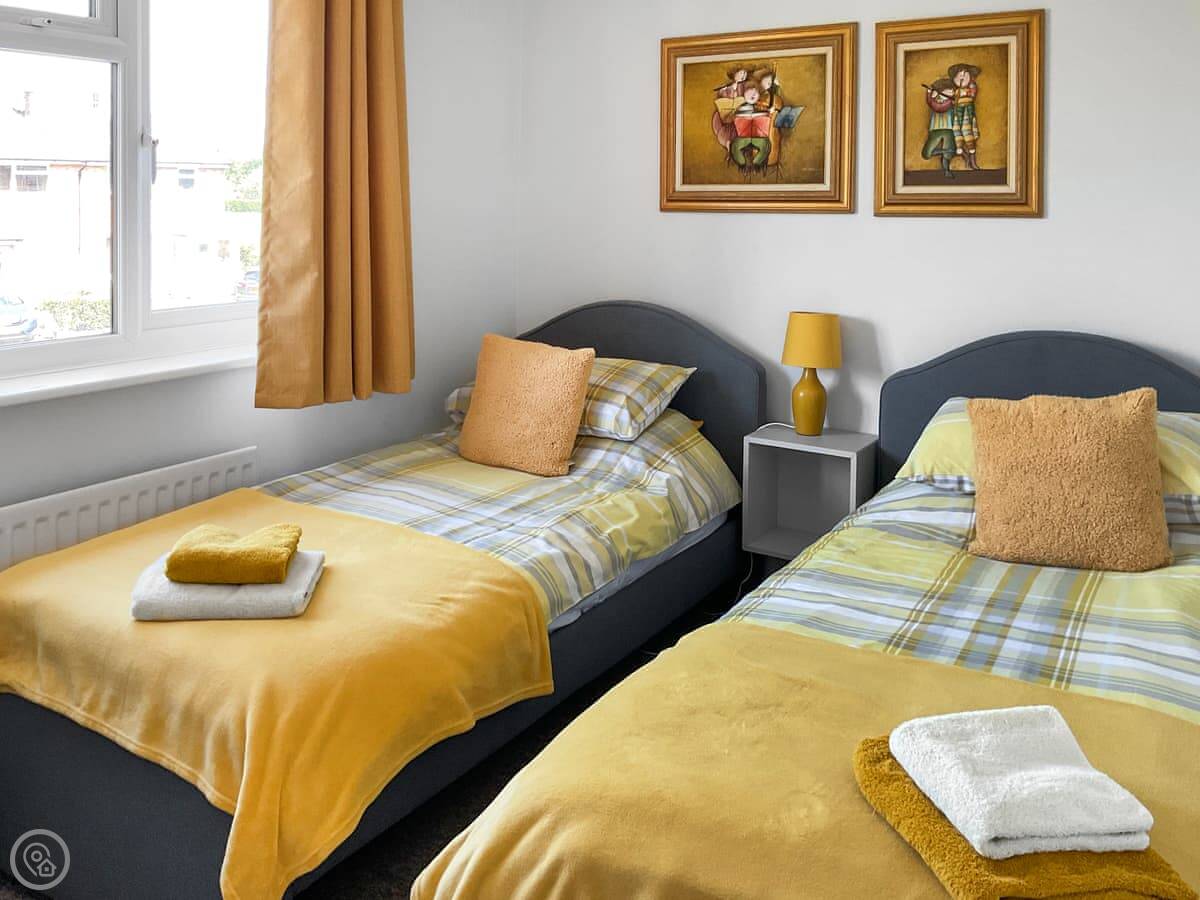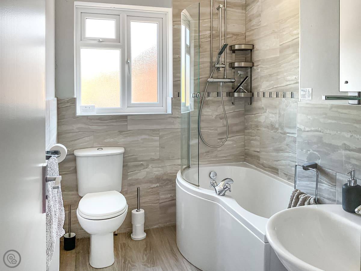 The house sleeps seven across four bedrooms. Two doubles and two singles, plus a put-you-up bed in one of the single rooms. There are two bathrooms, one with a shower cubicle and one with a bath. The stairs have a stairgate at the top.