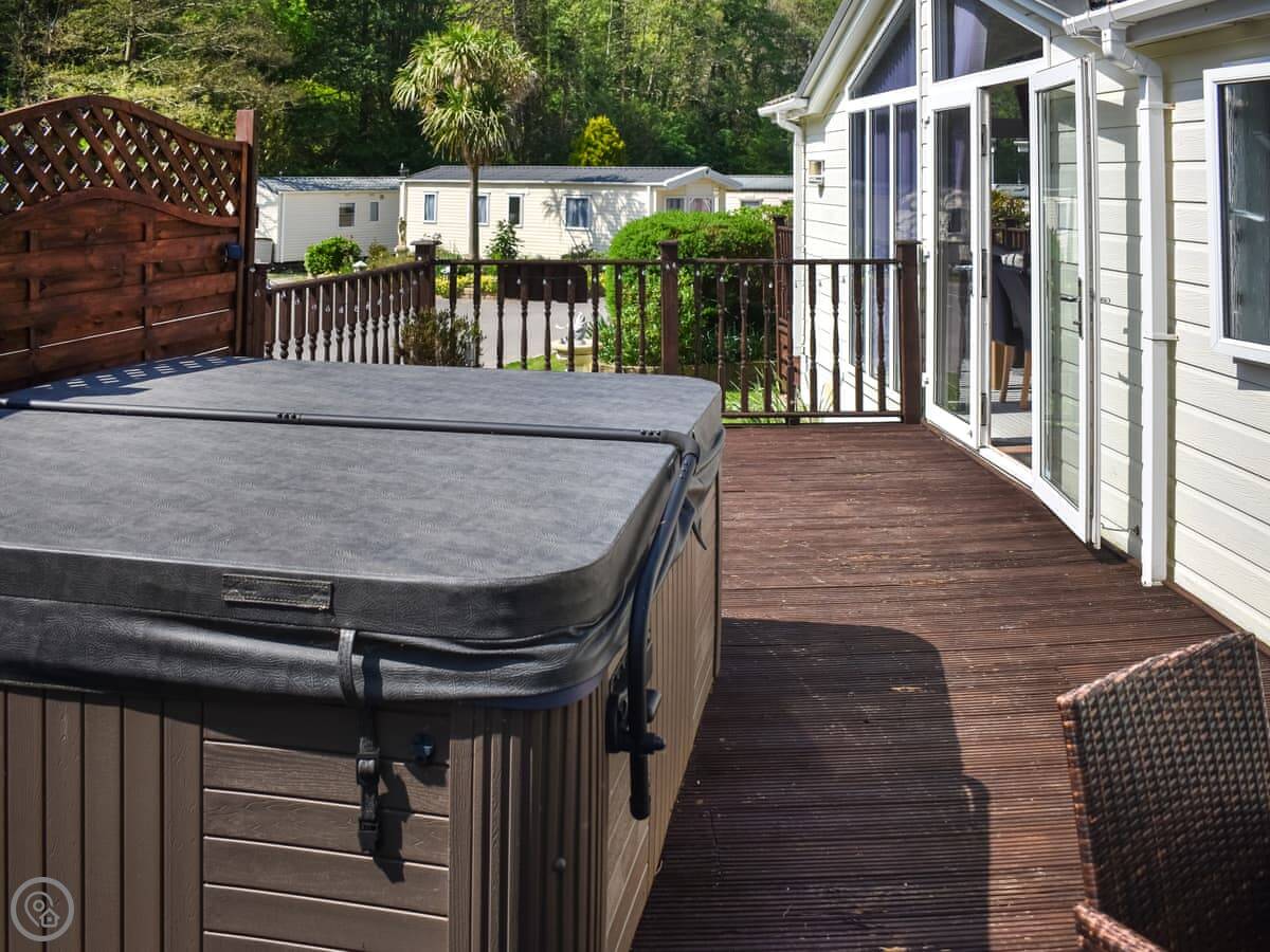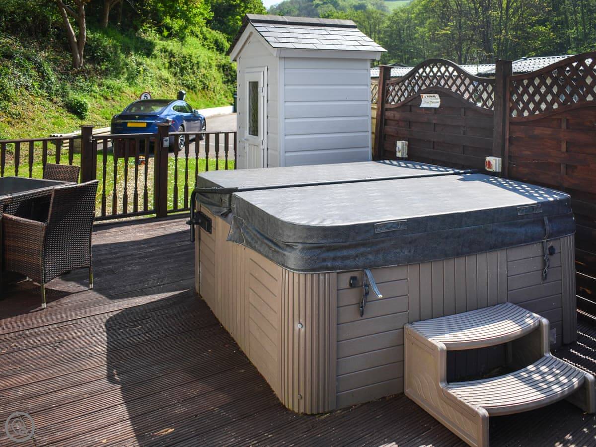 Outside, there's a deck with a hot tub and a sauna. The garden furniture is out there. You look out onto trees and hedges. It's quiet.
