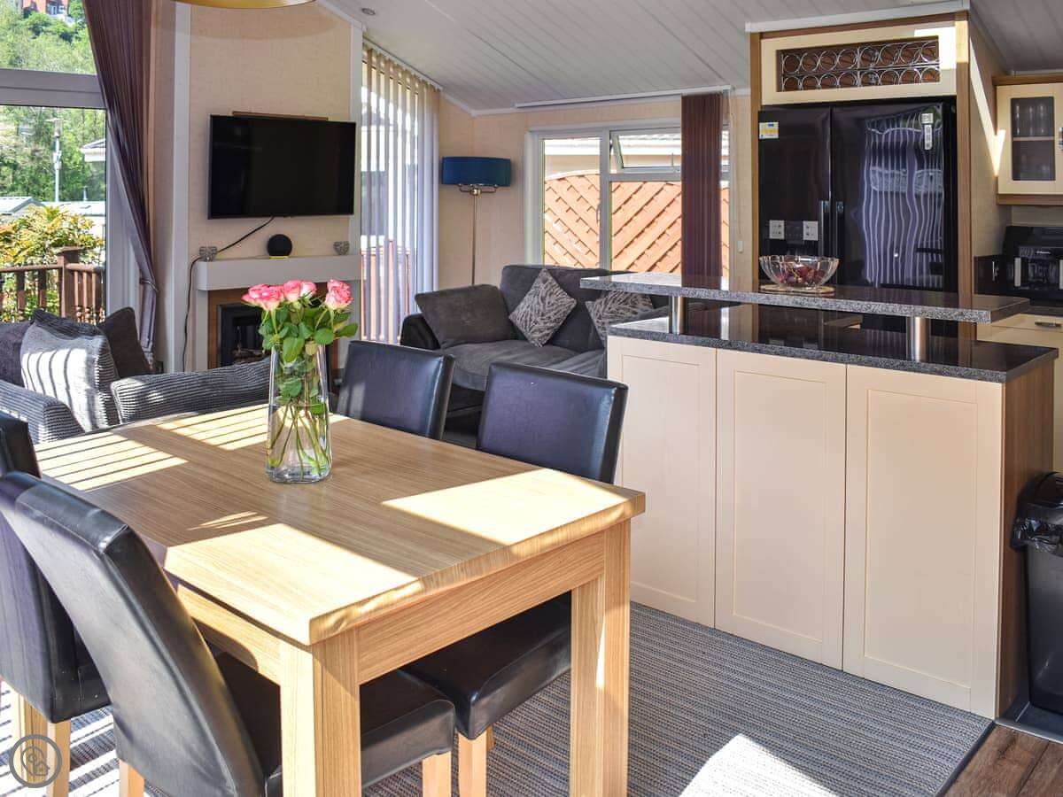 Inside is open plan. Kitchen, dining, and living area all in one room. There's a dishwasher and one of those big fridge freezers. TV and WiFi are included. Bedding and towels are too.