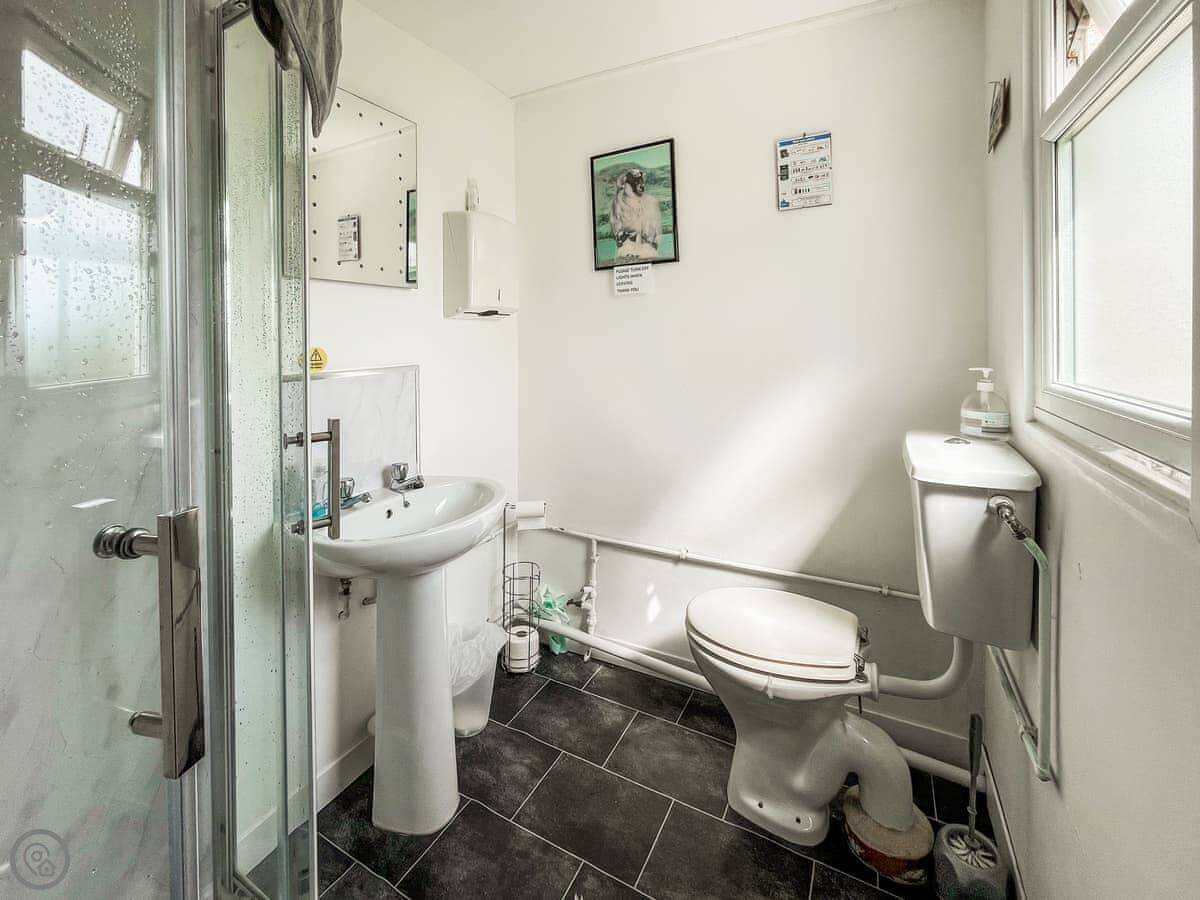It was built as a comfortable space, not a basic one. It's open plan. There's a wood burner for heat, a kitchenette with what you'll need for short stays, and the shower is in a separate cubicle attached to the back. Patio doors open straight out into a private, enclosed garden. The hot tub is out there.
