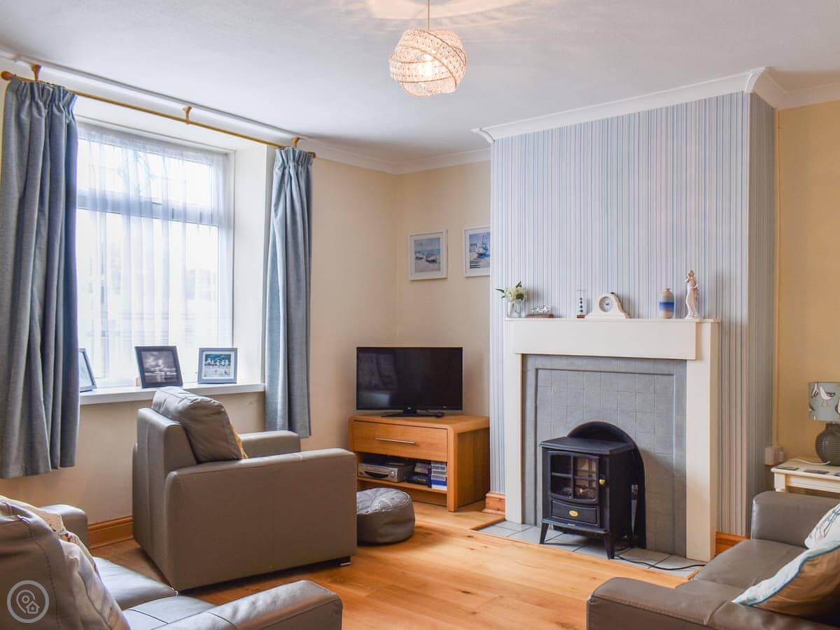 The main thing is the view. You can see the sea from the front rooms and the garden. The garden is enclosed, gets the sun, and has a lawn. You get two parking spaces right outside.
