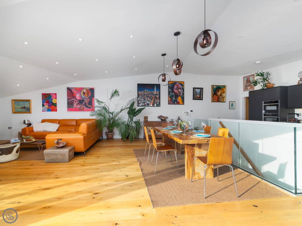 The stairs inside are quite steep in parts. The main living area is at the top of the house. The kitchen is well equipped. There's a wood burner for colder evenings. Outside, there's a hot tub on the deck and some garden space. Parking is on the drive and there's an electric vehicle charger.