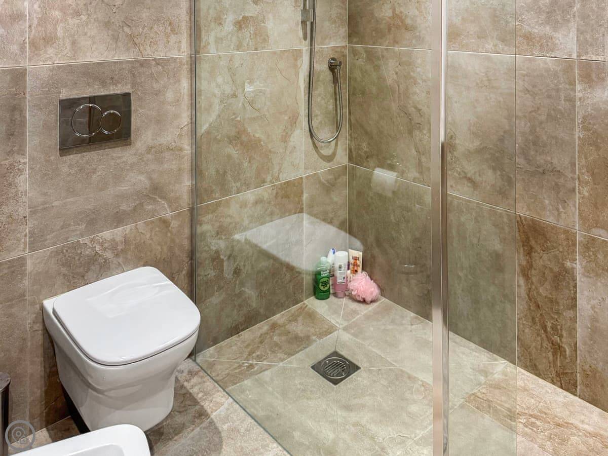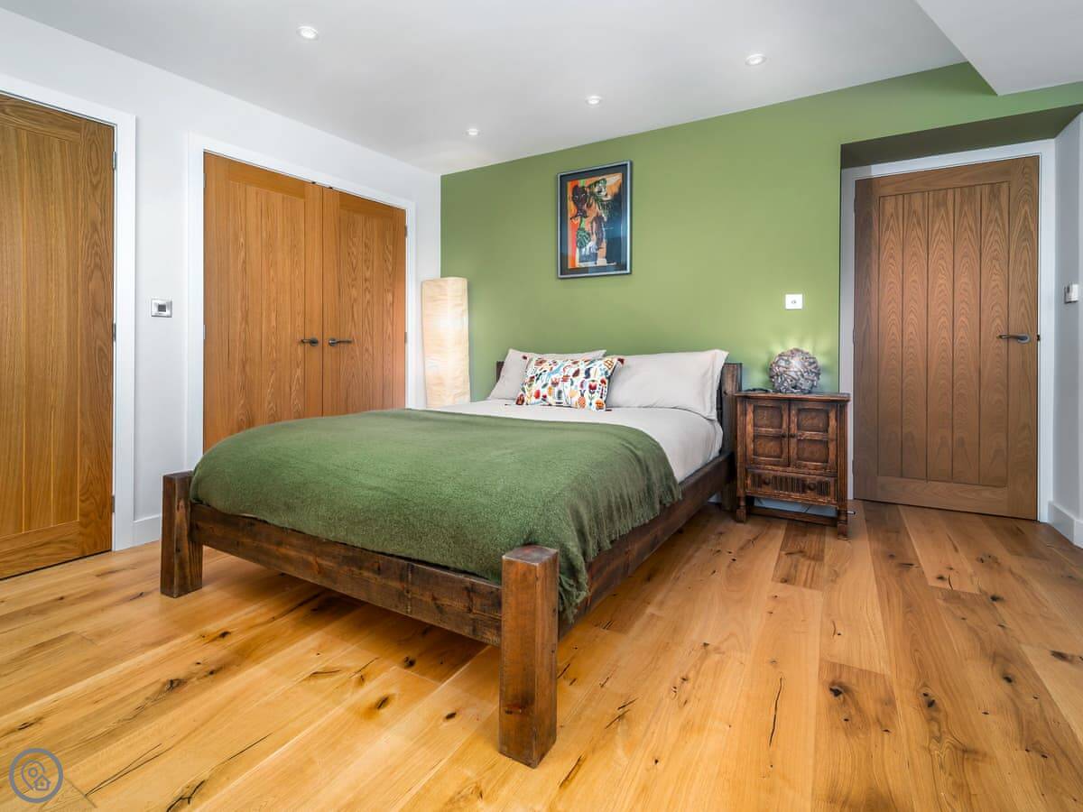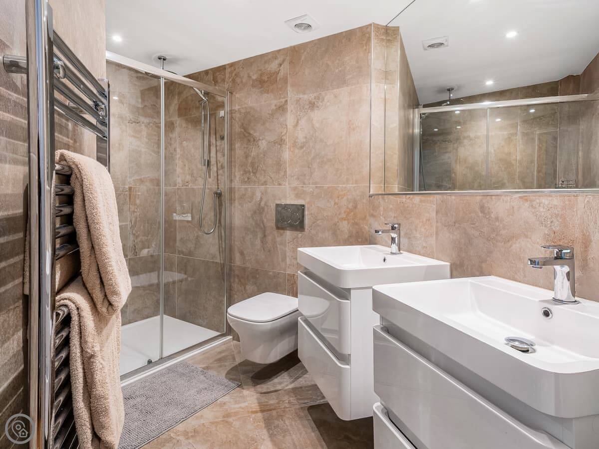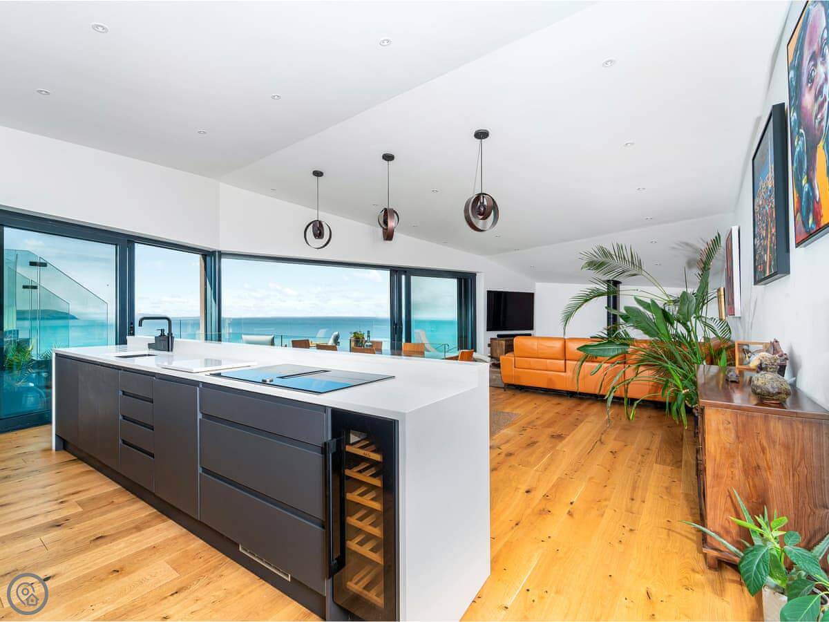 It sleeps eight in four bedrooms. Each bedroom has its own bathroom, which is handy for a group. It's a 5 Star property, so it's well finished and everything works as it should. The design is quite modern. Lots of angles and stone.