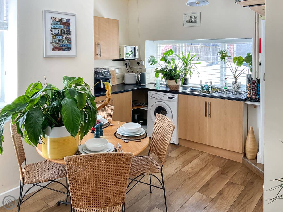 The living area is open plan, with a kitchen at one end. It's got everything you'd need. There's a PlayStation 5 and WiFi included.