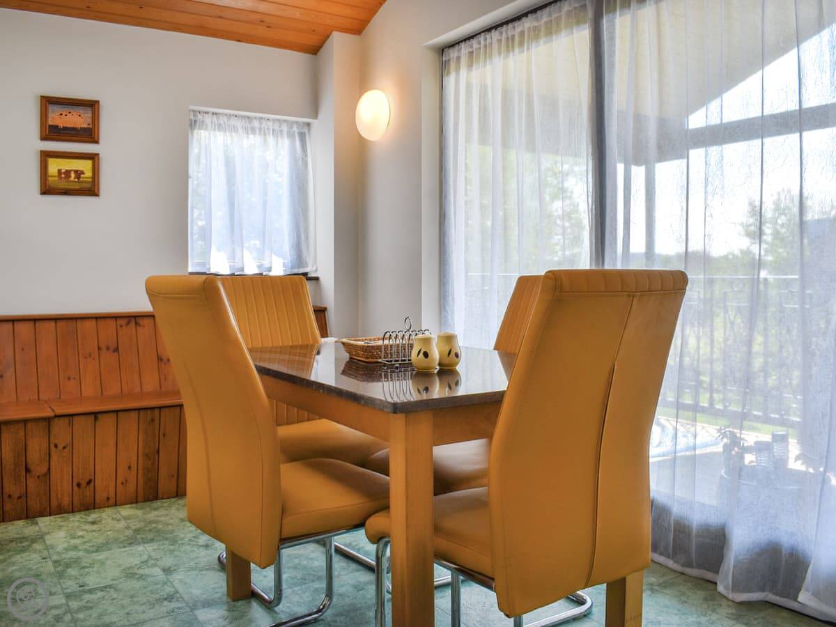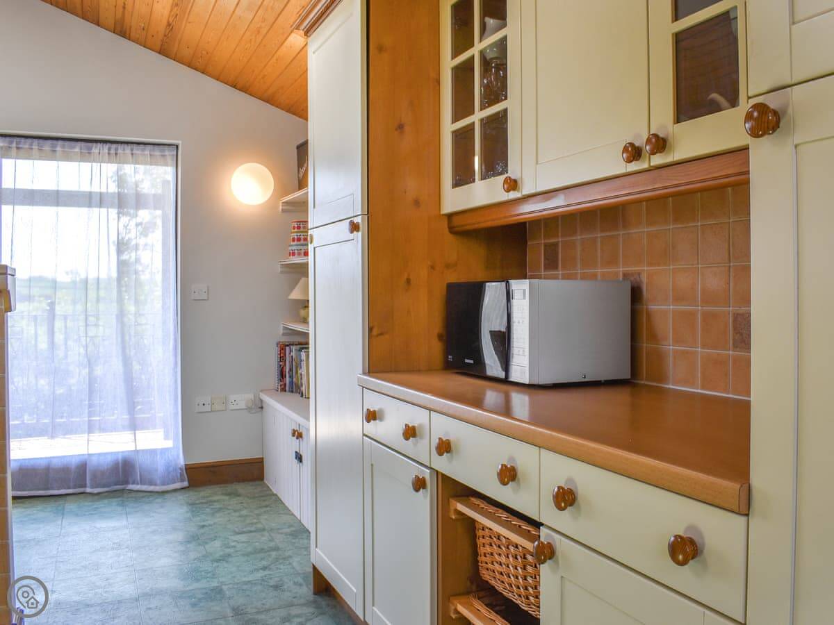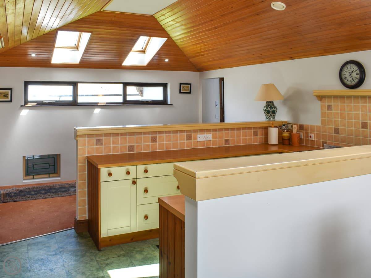 Inside, the main room is open plan. There's a wood burner in the middle, which heats the place well. The kitchen is decent and has a dishwasher. The bathroom is through the bedroom, which might be a bit odd for some people but it works fine.