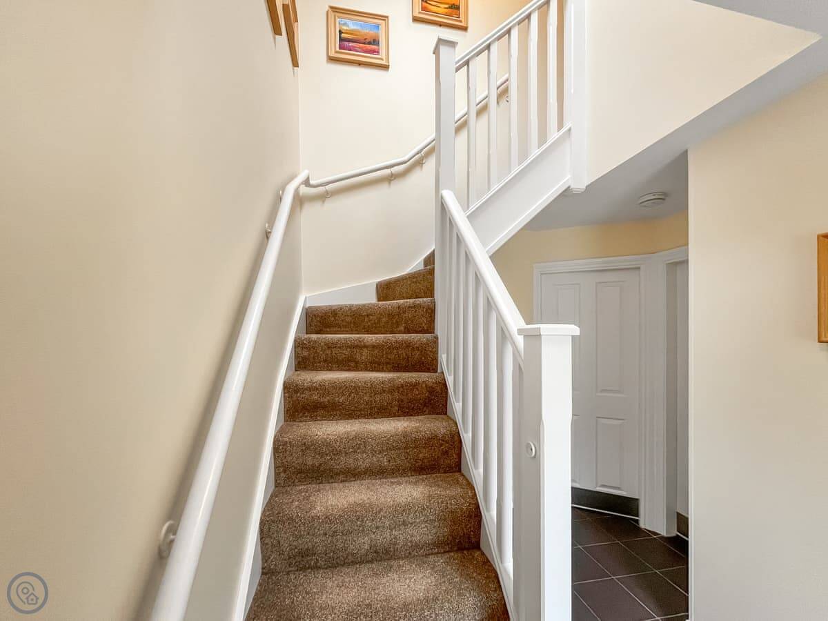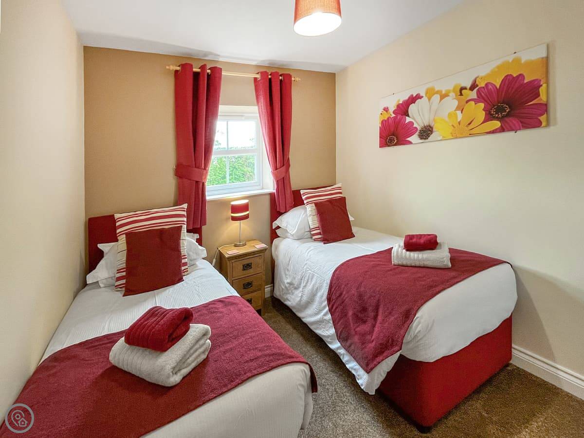 It sleeps four. Two bedrooms, two bathrooms. The master bedroom upstairs has a big bed and a whirlpool bath in the ensuite. The second bedroom is on the ground floor, it's twins, and it has an ensuite shower room. It has a 4 Star rating. Everything's included, bedding, towels, that sort of thing.
