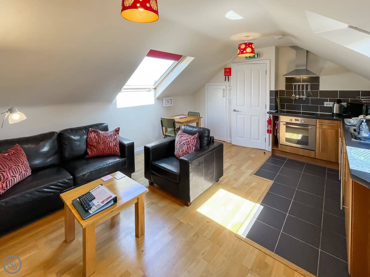 It’s a 4 Star place. It’s comfortable and clean, with decent facilities for a week or two. The ceilings are sloped because it’s in the loft, but there’s good headroom. The skylights look out over fields.