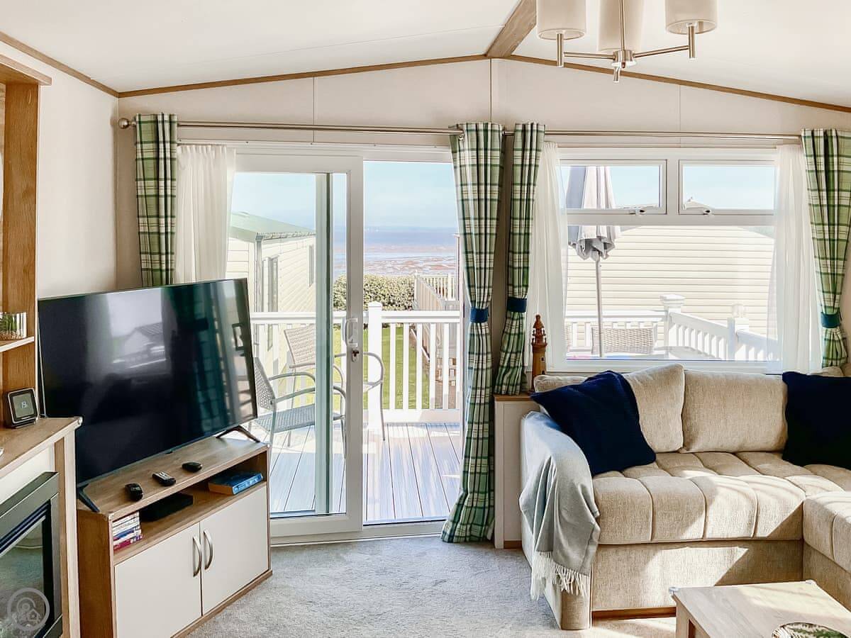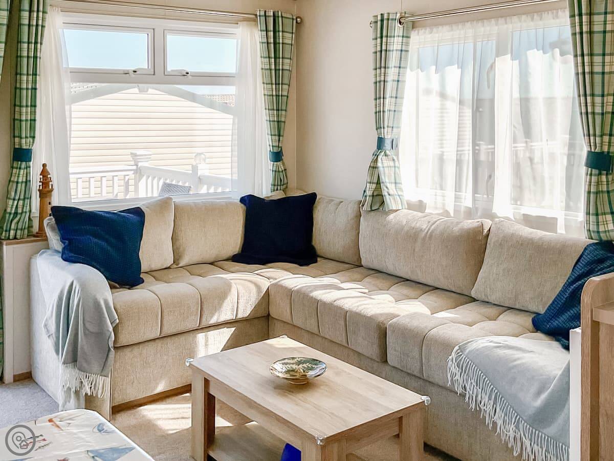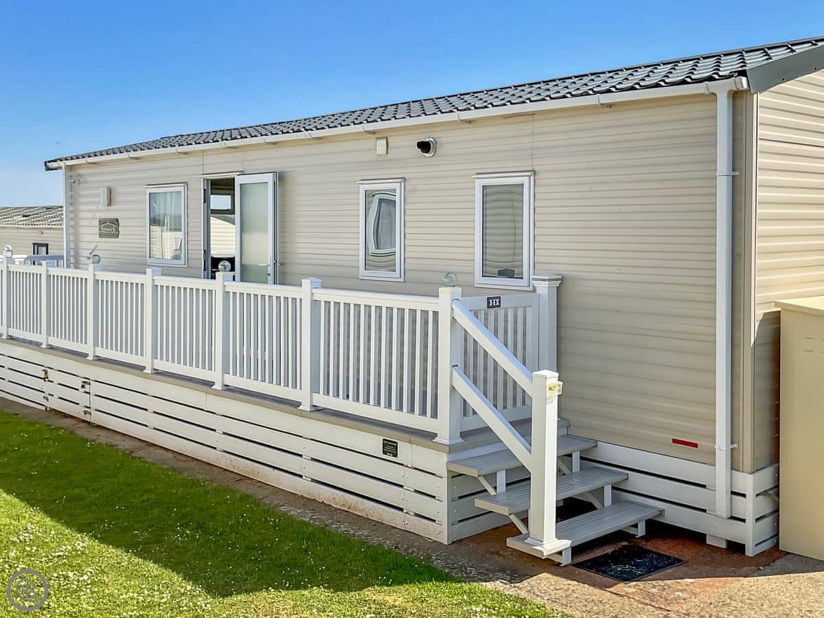 Seaside Jollys is a static holiday home on Hoburne Blue Anchor holiday park. It's modern, detached, and looks right out over the sea. You get the views but you're on a park, so it's not secluded.