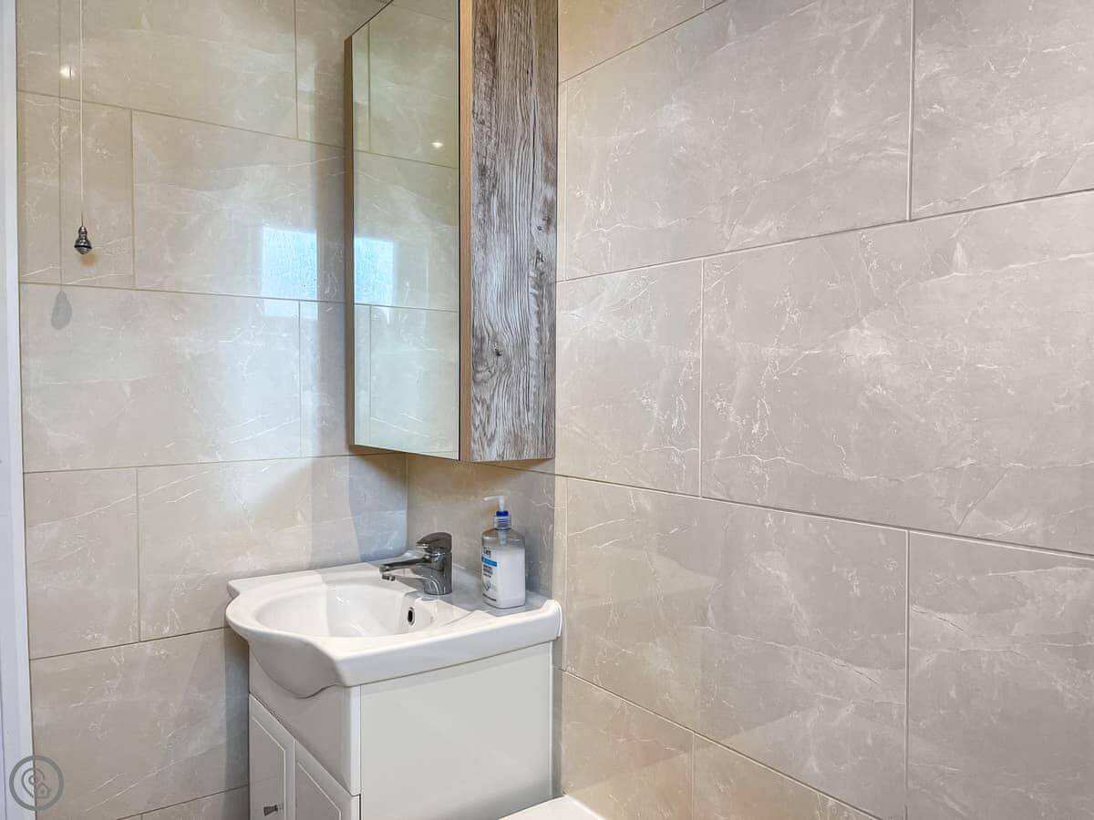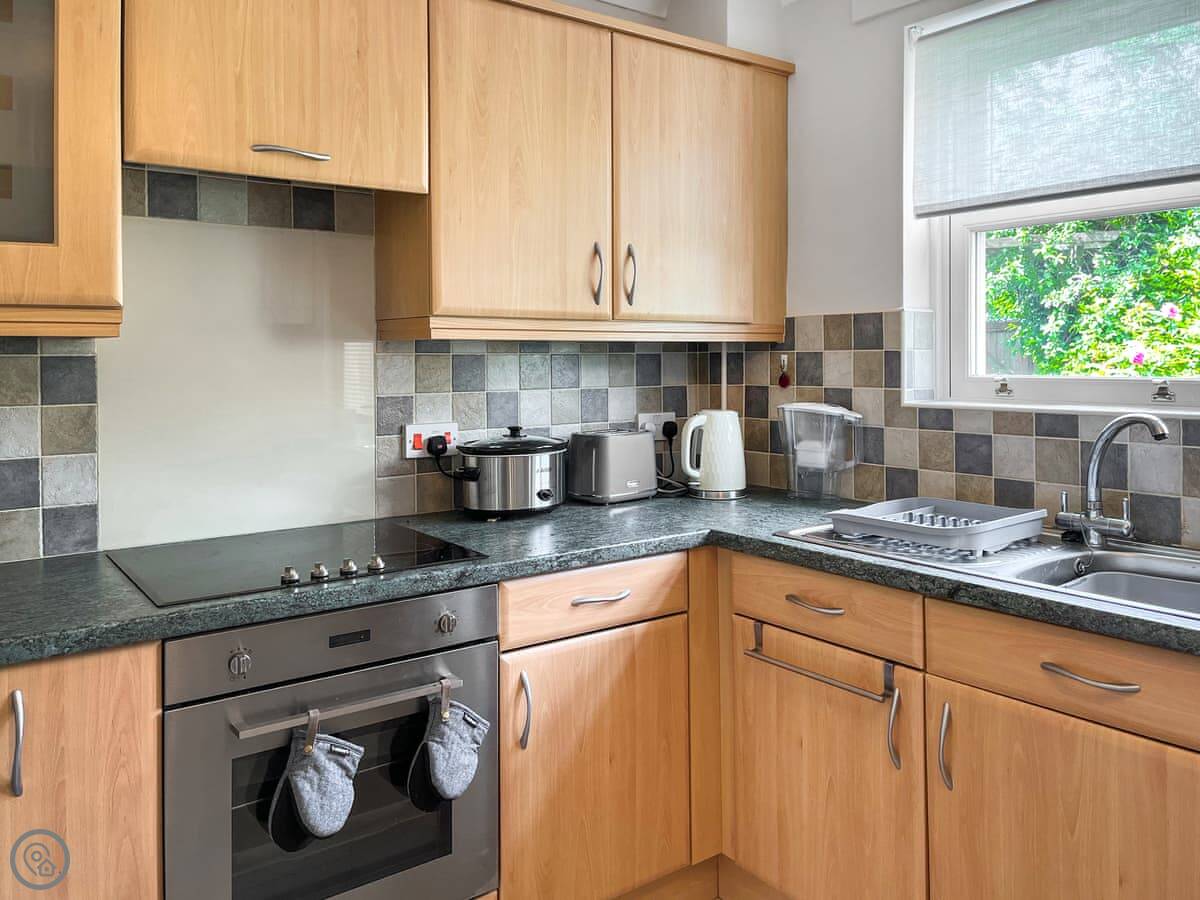 For facilities, it's got the things you'd expect: WiFi, TV, a washing machine, and a dishwasher. Bedding and towels are included. There's parking for one car on the drive.