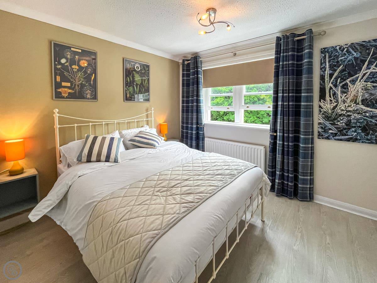 It sleeps four. There are two bedrooms, one with a king-size bed and the other has bunk beds. One bathroom. It's a 4 Star rating, so it's comfortable and well-equipped.