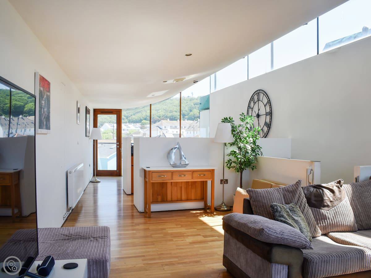 The main living space is upstairs. It's open plan, with the kitchen at one end and the sitting area at the other. You get a smart TV and a DVD player. The kitchen has an induction hob, an oven, a dishwasher, and a fridge freezer.
