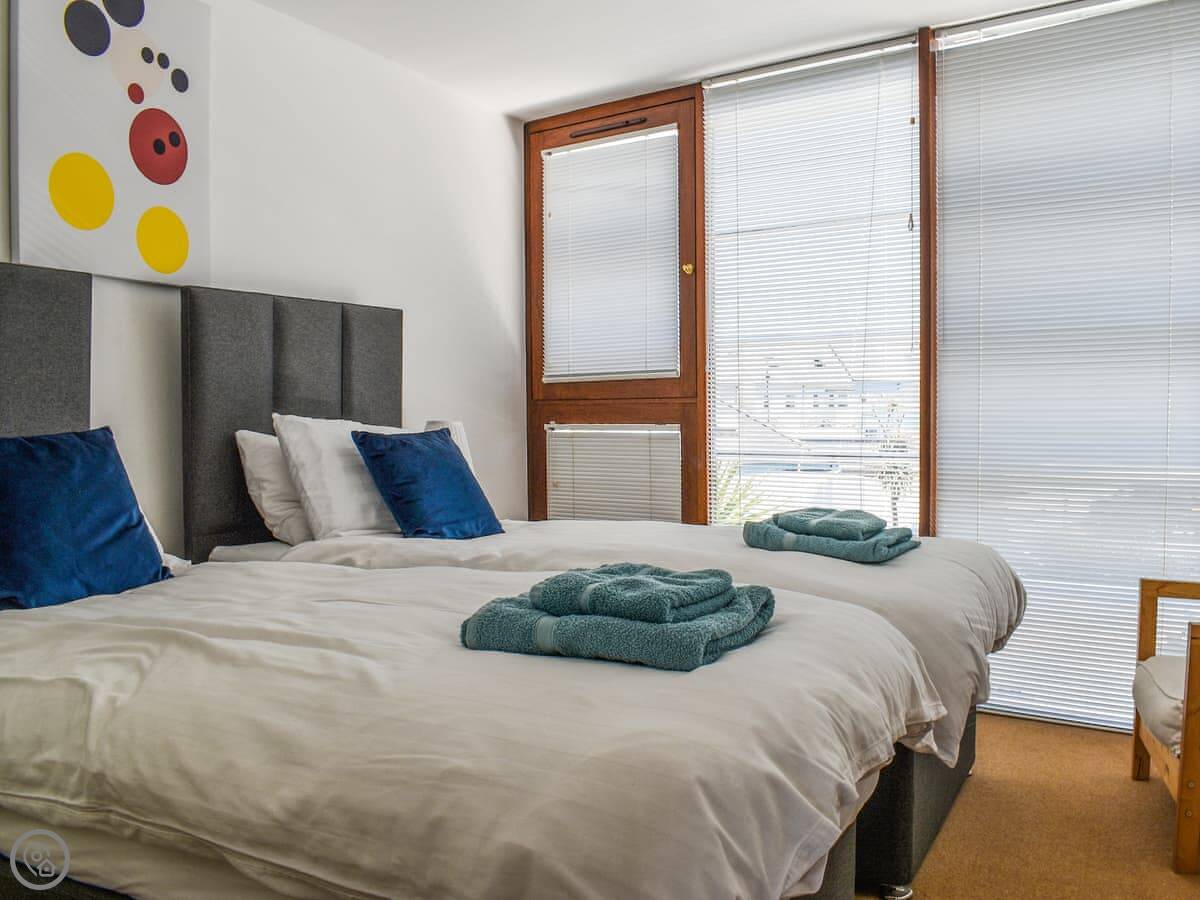 It sleeps four, in two bedrooms. One has a large bed and its own bathroom with a shower over the bath. The other has two singles. There's a separate shower room with a washing machine in it too.